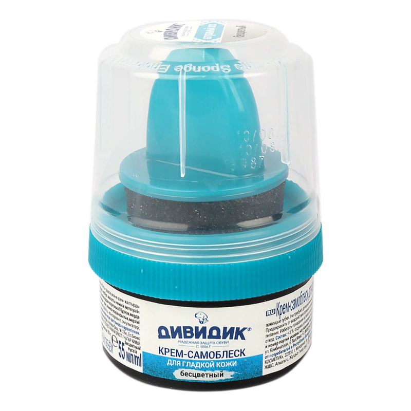 Крем «Самоблеск» в пластиковой банке с насадкой для нанесения имеет объем 55 мл Этот крем безцветный, предназначен для ухода за обувью любого цвета. Его формула способствует приданию обуви блеска, защищает от влаги и загрязнений, сохраняя ее качество и внешний вид. Простота использования делает его удобным средством для поддержания и ухода за обувью.