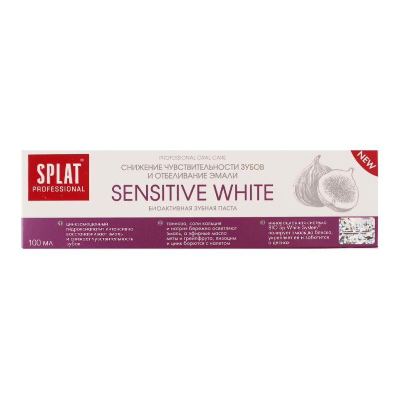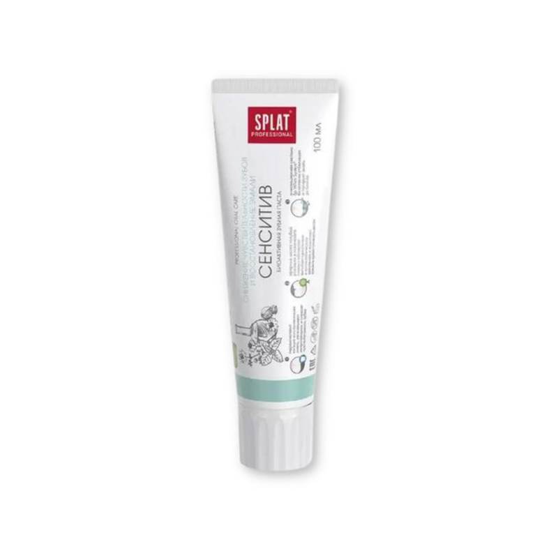 Зубная паста Splat Professional Sensitiv - это идеальное решение для тех, кто страдает от чувствительности зубов. Ее уникальная формула обеспечивает нежное очищение зубов, укрепляет эмаль и защищает от боли при контакте с холодными или горячими напитками. Эта зубная паста подходит для ежедневного использования и помогает укрепить зубную эмаль, предотвращая появление кариеса. Благодаря своим активным компонентам, она эффективно борется с бактериями и освежает дыхание на длительное время. Попробуйте зубную пасту Splat Professional Sensitiv уже сегодня и почувствуйте разницу с первого же применения!