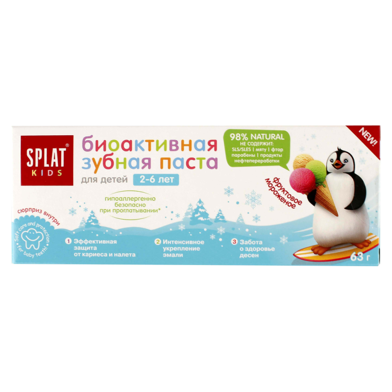 Паста зубная для детей серии Splat Kids Фрукт Морожен имеет приятный вкус и аромат, что делает чистку зубов более привлекательной для детей. Она содержит натуральные фруктовые экстракты, которые помогают бороться с бактериями и предотвращают образование зубного налета. Состав пасты включает в себя фторид натрия, который укрепляет зубную эмаль и предотвращает развитие кариеса.