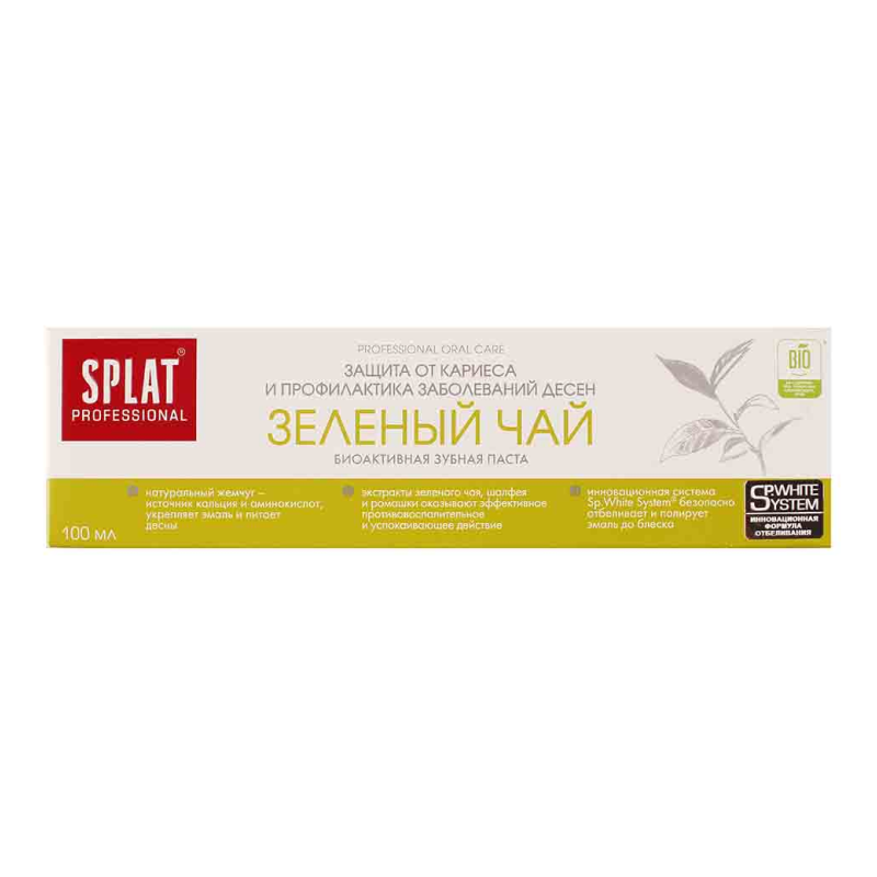 Зубная паста Splat Professional с экстрактом зеленого чая - идеальное решение для здоровья вашей улыбки! Этот продукт обеспечивает нежное очищение зубов, защиту от кариеса и освежающий аромат зеленого чая. Попробуйте использовать эту пасту утром и вечером для максимального эффекта. Рекомендуемая доза - небольшое количество на щетку. Не забудьте массировать десны для улучшения кровообращения. Создайте свой ритуал ухода за зубами с зубной пастой Splat Professional и наслаждайтесь свежестью и чистотой каждый день!