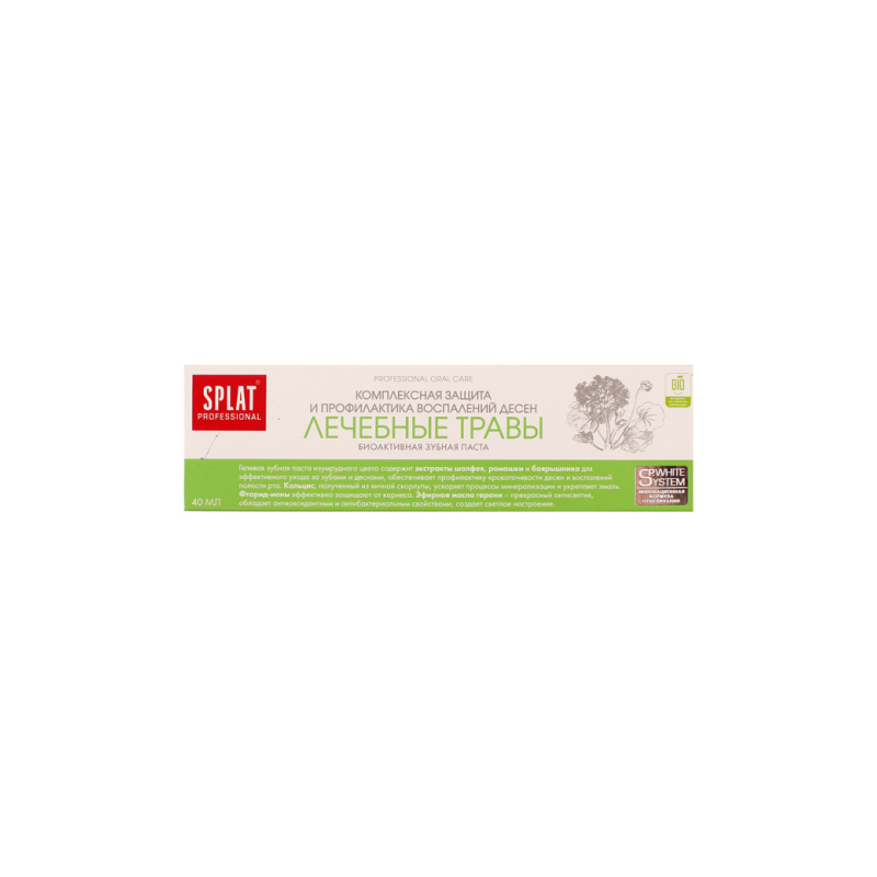 Зубная паста Splat Professional с лечебными травами - идеальное решение для здоровья вашей улыбки. Ее уникальная формула обогащена натуральными экстрактами трав, которые помогают бороться с зубными проблемами и укрепляют десны. Эта паста не только эффективно очищает зубы, но и обеспечивает свежесть дыхания на долгое время. Используйте зубную пасту Splat Professional с лечебными травами два раза в день для достижения оптимальных результатов. Попробуйте ее в сочетании с мягкой зубной щеткой для бережного ухода за зубами и деснами. Вдохновитесь заботой о своем улыбке и сделайте правильный выбор - выберите зубную пасту Splat Professional с лечебными травами прямо сейчас!