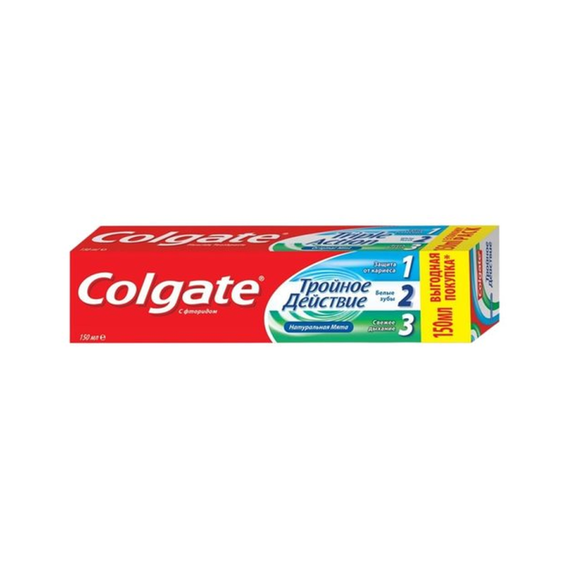 Паста зубная Colgate Тройное действие, объемом 150 мл Она предназначена для комплексного ухода за полостью рта. Паста обеспечивает три действия: защиту от кариеса, борьбу с зубным налетом и освежающий эффект. Она эффективно очищает зубы, предотвращает образование зубного налета и укрепляет зубную эмаль. Паста Colgate Тройное действие обеспечивает свежее дыхание и долговременное ощущение чистоты во рту. #carefood #зубнаяпаста