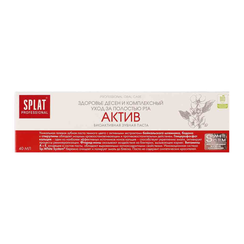 Зубная паста Splat Professional Актив - это идеальное решение для тех, кто ценит заботу о своем здоровье и красоте улыбки. Специально разработанная формула обеспечивает эффективное очищение зубов, защиту от кариеса и освежающее дыхание на длительное время. Благодаря активным компонентам, паста помогает бороться с зубным налетом и предотвращает образование зубного камня. Эта зубная паста подойдет как для ежедневного использования, так и для интенсивного ухода за зубами. Рекомендуется использовать два раза в день для достижения максимального эффекта. Попробуйте Splat Professional Актив уже сегодня и почувствуйте разницу с первого же применения!