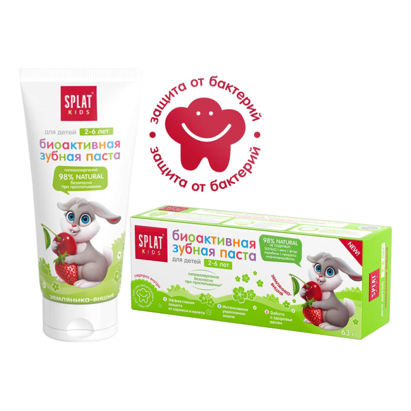 Зубная паста содержит вещества специально подобранные для ухода за детскими зубами. Ксилит, натрия монофторфосфат и кальция глицерофосфат предотвращают появление кариеса, способствуют укреплению и формированию зубов. Витамин Е сохраняет здоровье десен. Диоксида кремния - современный абразив, для бережного очищения и защиты эмали. Со вкусом клубники. Для детей от 2-х лет и старше.