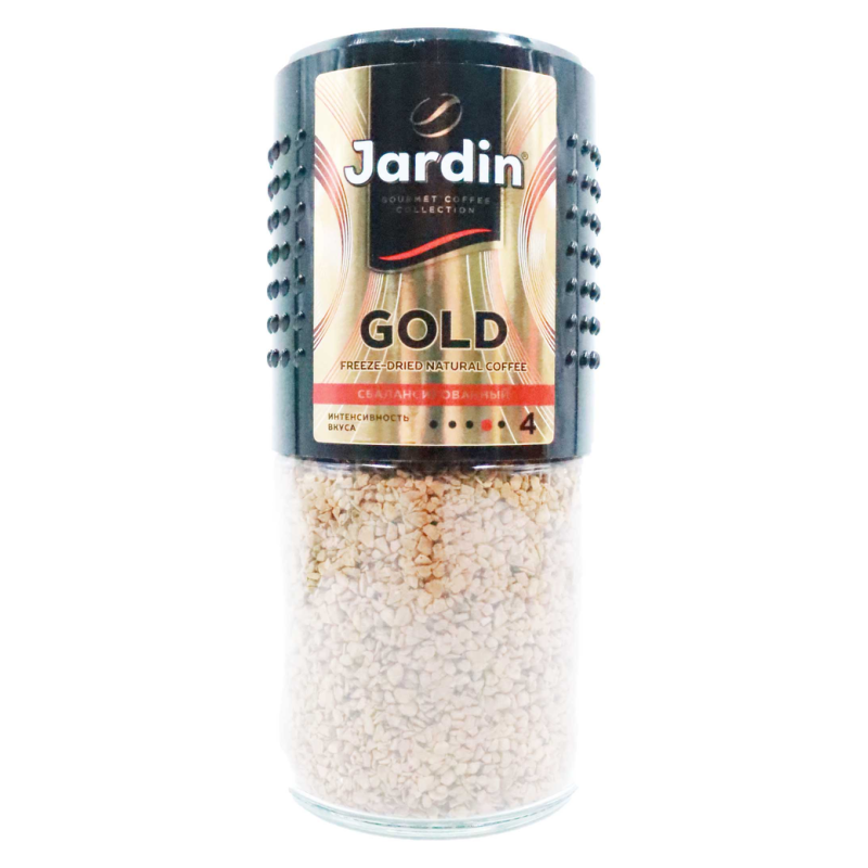 Кофе Jardin Gold растворимый стандартный бленд в зернах весом 95 г амм. Он состоит из арабики и робусты, прошедших процесс обжарки на среднем уровне. Этот кофе имеет приятный аромат и вкус с нотками молочной шоколадной горчинки.