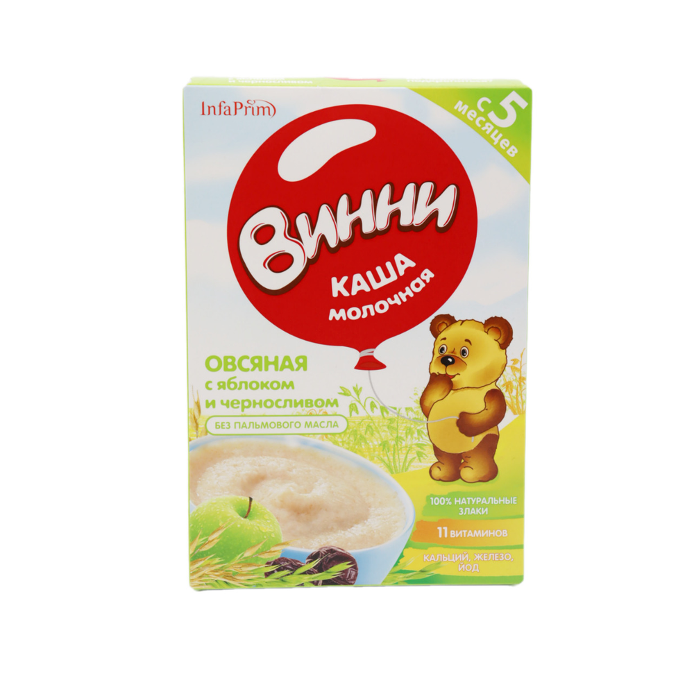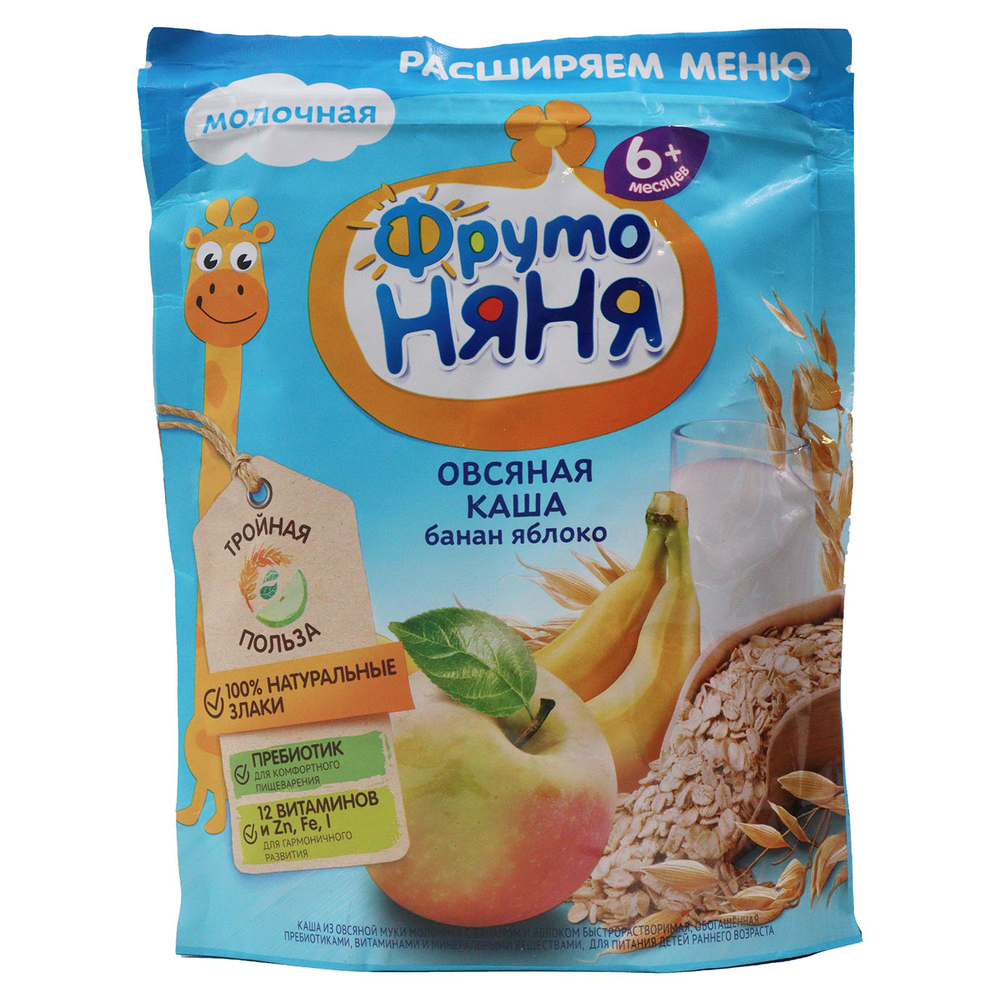 Каша из овсяной муки с молоком, бананом и яблоком быстрорастворимая, обогащенная пребиотиками, витаминами и минеральными веществами, для питания детей раннего возраста. Без искусственных добавок. Без красителей. Без гмо.
