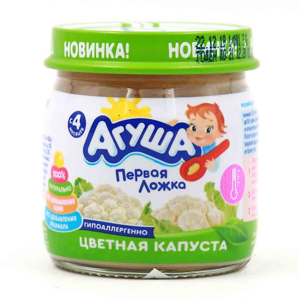 Пюре «Агуша Овощное» с цветной капустой представлено в стеклянных банках объемом 80 г амм. Это натуральное детское питание, подходящее для малышей старше 4 месяцев. Состав: цветная капуста.