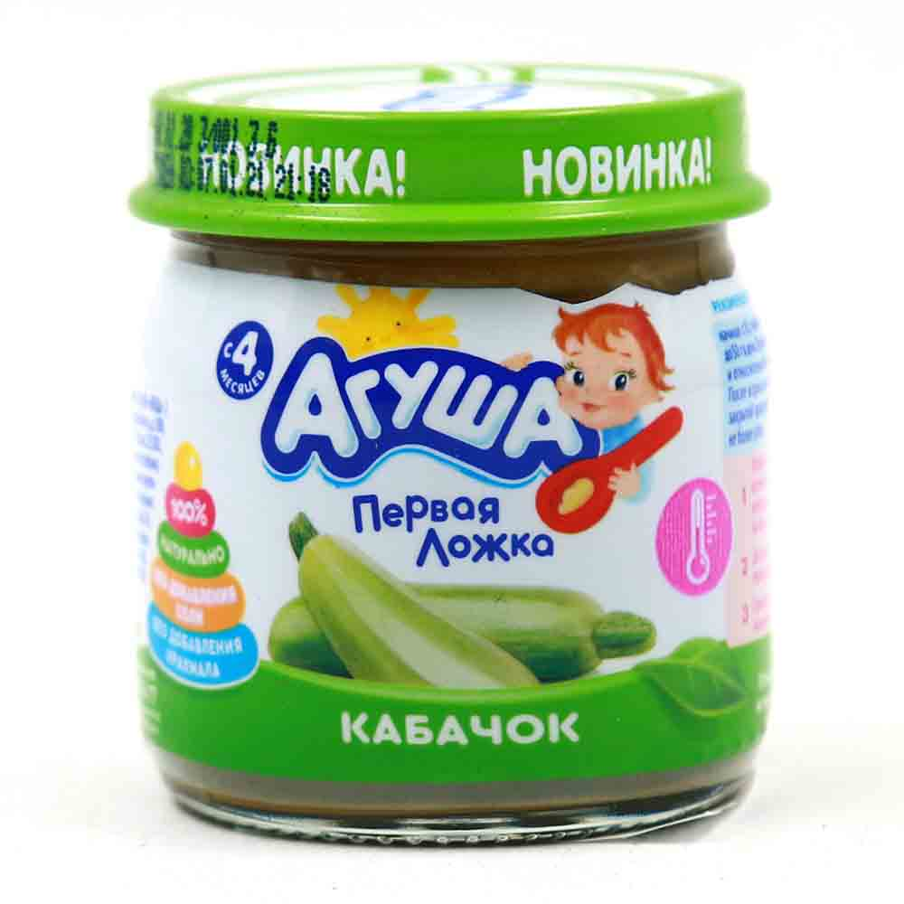 Пюре «Агуша Овощное» с кабачком представлено в стеклянных банках объемом 80 г амм. Это детское питание, пригодное для детей старше 4 месяцев. Состав: кабачок.