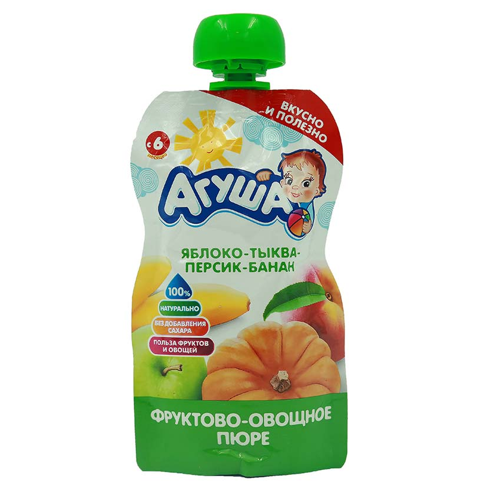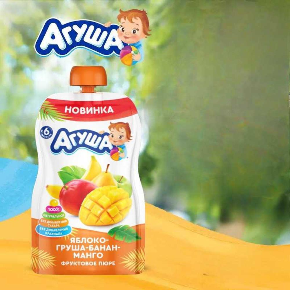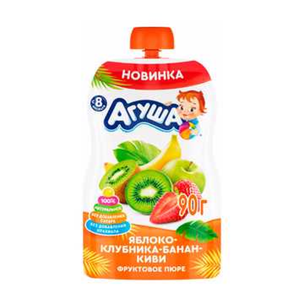 Пюре «Агуша Фруктовое Яблоко Клубника Банан Киви» представлено в пауч-упаковке объемом 90 г амм. Это детское питание, пригодное для детей старше 4 месяцев. Состав включает в себя яблоки, клубнику, бананы и киви.
