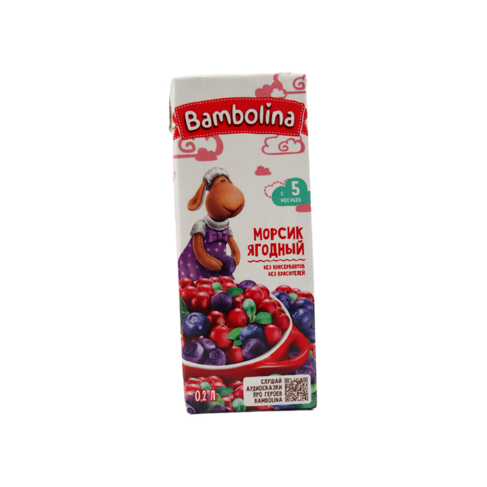 Морс Bambolina мультиягодный ТП 200 мл - это освежающий напиток, который подходит для употребления в любое время года. Он изготовлен из натуральных ягод, которые придают ему яркий вкус и аромат. Состав напитка включает в себя воду, сахар, ягоды (клубника, малина, черника), лимонную кислоту и пищевые добавки.