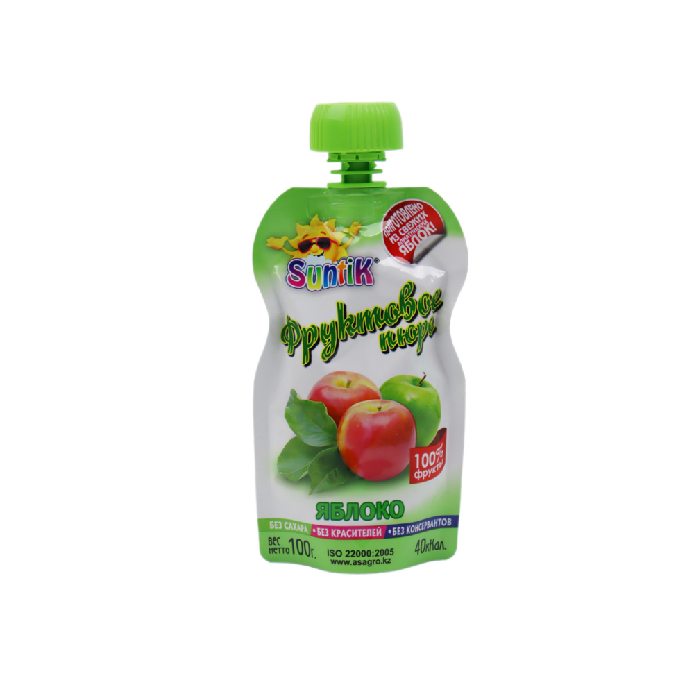 Пюре «Фруктовое SunTik Яблоко» представлено в пауч-упаковке объемом 100 миллилитров. Это детское питание, рекомендованное для детей старше 4 месяцев. Состав включает в себя яблоки, без добавления других ингредиентов.