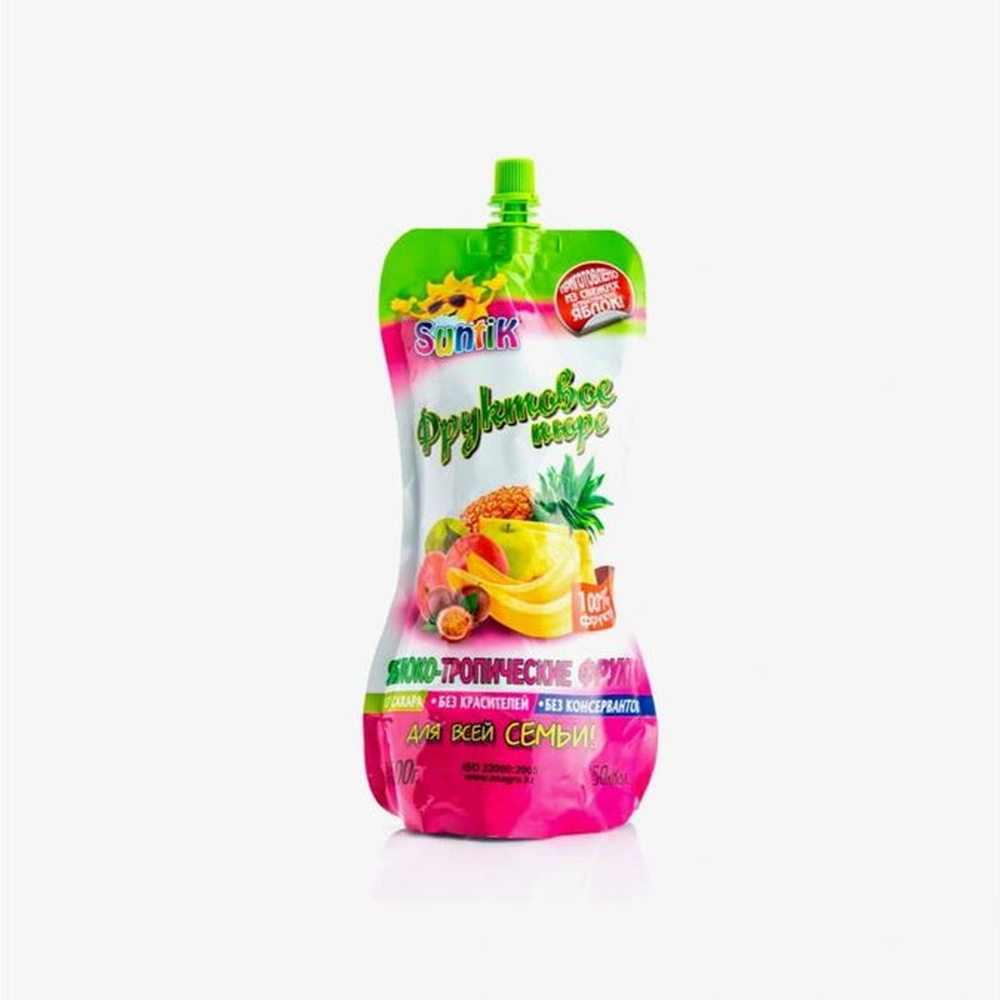 Пюре «SunTik Фруктовое Яблоко-Тропические Фрукты» представлено в пауч-упаковке объемом 100 миллилитров. Это детское питание, рекомендованное для детей старше 4 месяцев. Состав включает в себя яблоки и различные тропические фрукты, без добавления других ингредиентов.