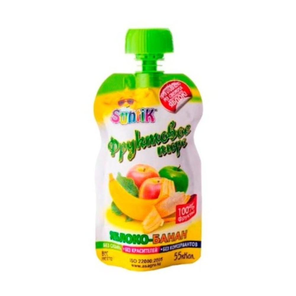 Пюре «Фруктовое SunTik Яблоко-Банан» представлено в пауч-упаковке объемом 100 миллилитров. Это детское питание, рекомендованное для детей старше 4 месяцев. Состав включает в себя яблоки и бананы, без добавления других ингредиентов.