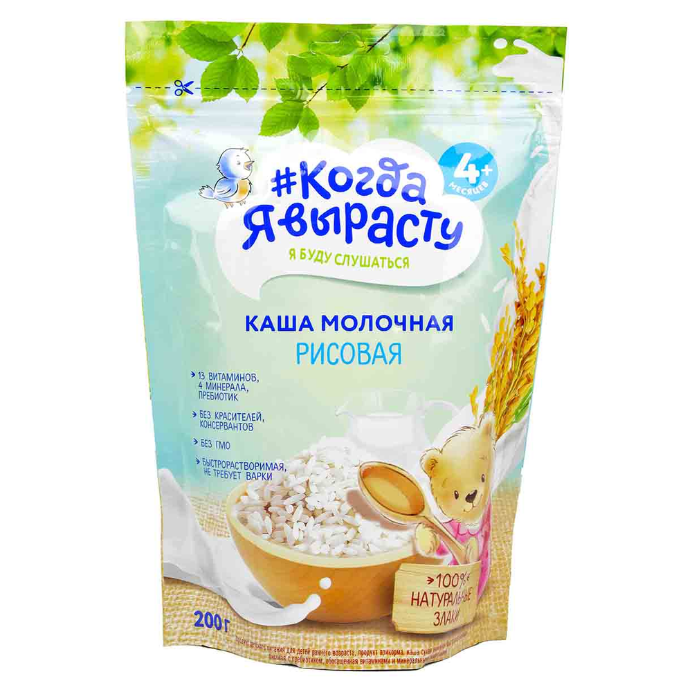 Каша «Когда я вырасту» рисовая с 4-х месяцев подходит для детей, начиная с этого возраста. Она представлена в удобной упаковке по 200 г амм, что позволяет легко дозировать порцию. Каша содержит молочный продукт, что обеспечивает дополнительное питание ребенка.