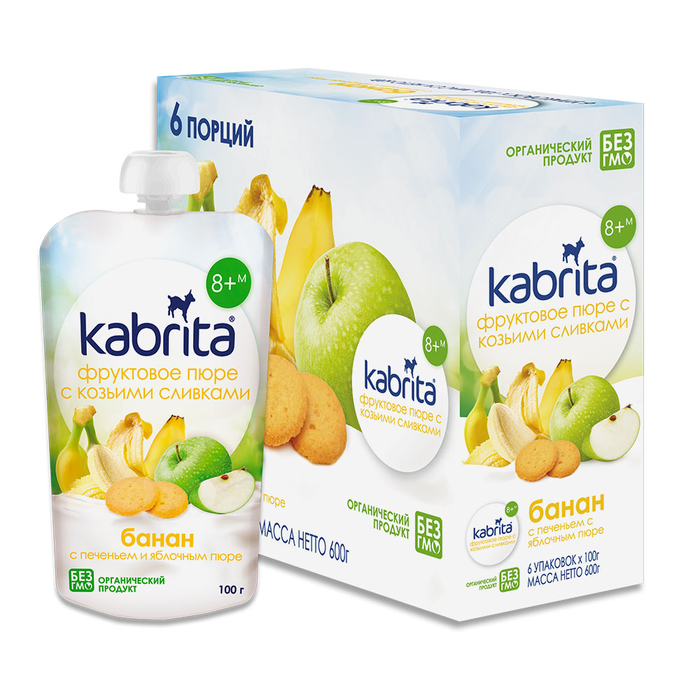 «Банан с печеньем и яблочным пюре», с 8 месяцев, 100 г Спелые бананы, сладкое яблоко и вкусное детское печенье в сочетании с нежными сливками козьего молока круглый год. Изысканный и вкусный десерт из органических фруктов. Идеальное решение для прогулок и перекуса как для малышей, так и для детей более старшего возраста. Удобная и опрятная мягкая упаковка способствует развитию мелкой моторики малыша и навыков самостоятельности. Не требует
