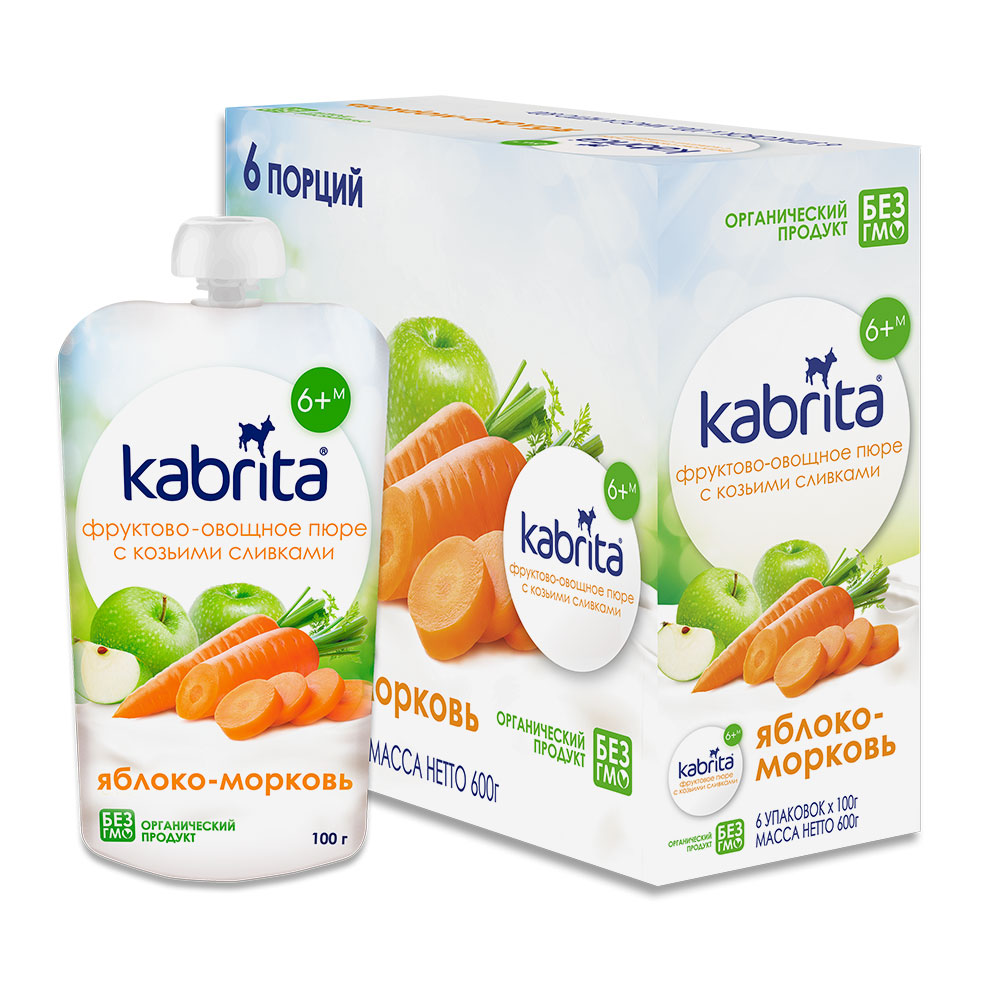 «Яблоко-Морковь», с 6 месяцев, 100 г Спелые яблоки и сладкая морковь в сочетании с нежными сливками козьего молока круглый год. Изысканный и вкусный десерт из органических фруктов и овощей. Идеальное решение для прогулок и перекуса как для малышей, так и для детей более старшего возраста. Удобная и опрятная мягкая упаковка способствует развитию мелкой моторики малыша и навыков самостоятельности. Не требует хранения в холодильнике. Д