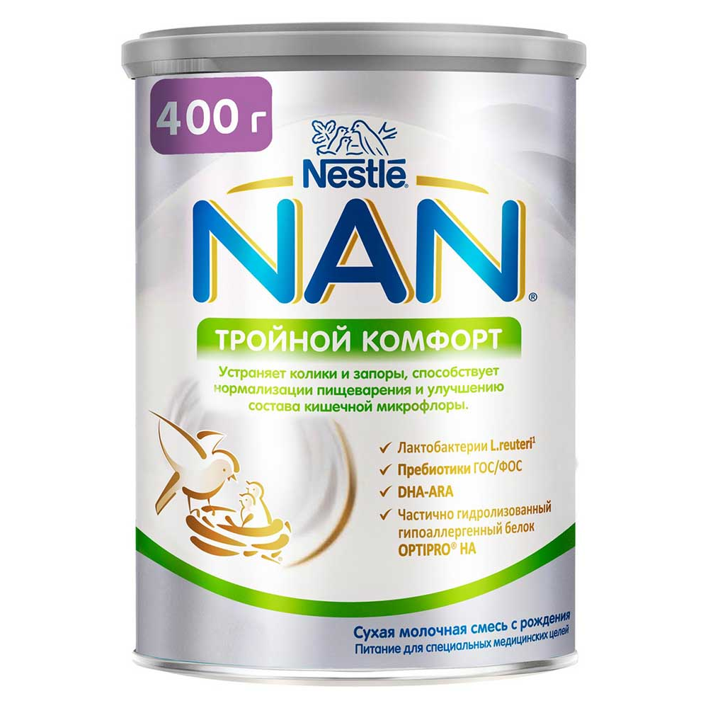 Смесь Nan Тройной Комфорт 400 г - это продукт, разработанный для детей с возрастом от до 12 месяцев, предлагающий тройное комфортное усиленное пищеварение, поддержание нормальной микрофлоры и иммунологическую защиту. Ее состав обогащен адаптированным молоком и важными питательными компонентами, включая белки, витамины и минералы, необходимые для здорового роста и развития малышей.
