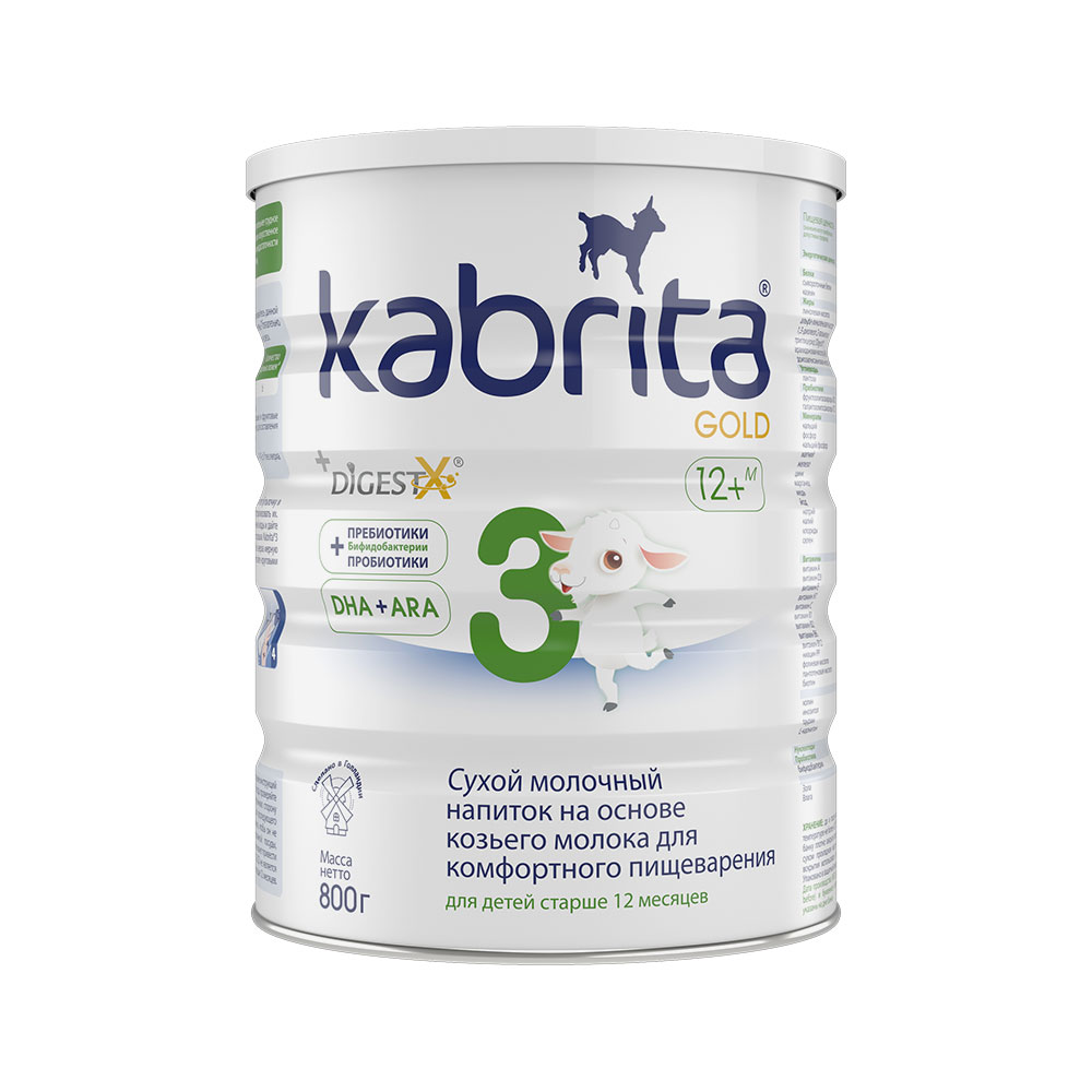 Kabrita 3 Gold – нежный и вкусный молочный напиток из натурального нидерландского козьего молока с добавлением ценнейшей козьей сыворотки. Козье молоко и продукты на его основе хорошо усваиваются и переносятся. Две порции Kabrita 3 в день компенсируют (% от суточной потребности) до 50% кальция, 30% железа и 70% йода. Смеси Kabrita – сбалансированное, полноценное и бережное питание с рождения. DigestX – комплекс жиров с бета-пальмитатом, подобный жировому профилю грудного молока, способствует