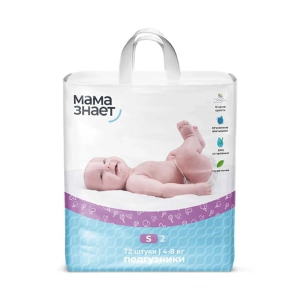Подгузники «Мама знает» размер S/2, упаковка 72 штуки, предназначены для детей весом от 4 до 8 кг Основные характеристики этих подгузников включают: