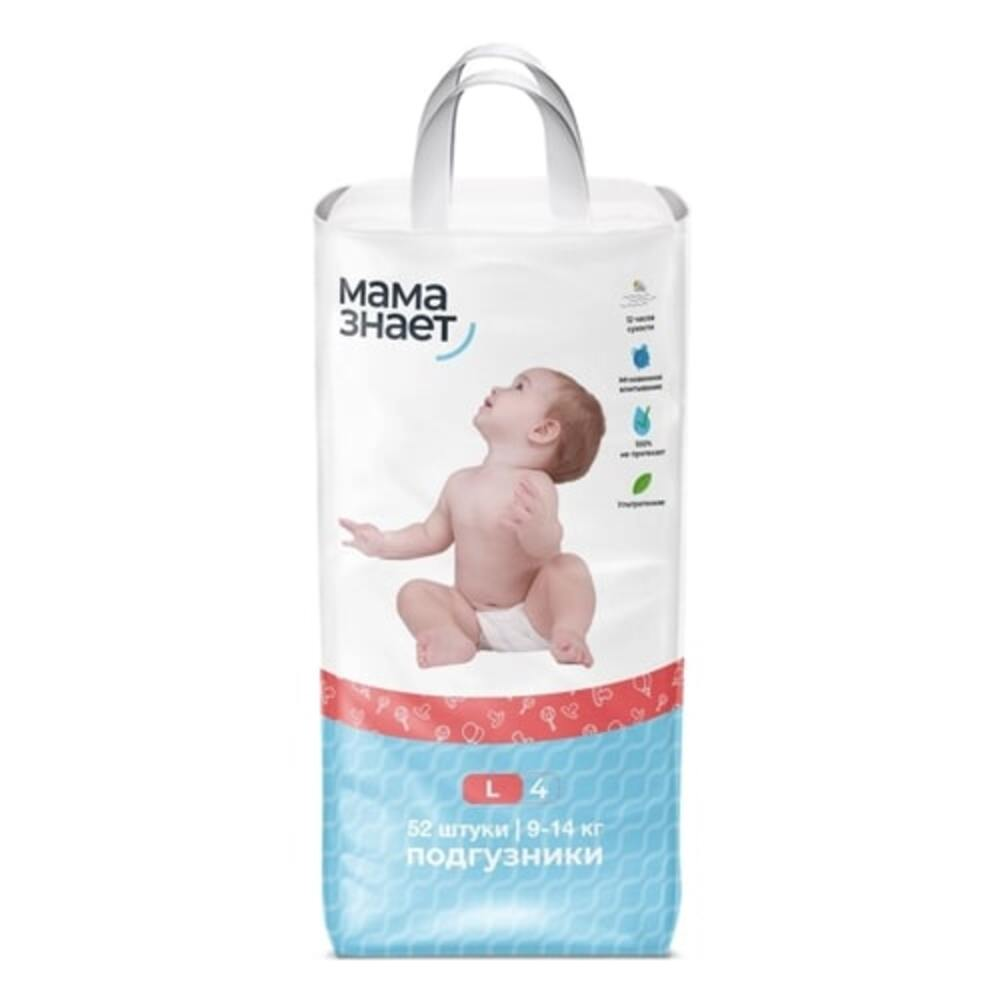 Подгузники «Мама знает» размер L4, упаковка 52 штуки, предназначены для детей весом от 9 до 14 кг Основные характеристики этих подгузников включают: