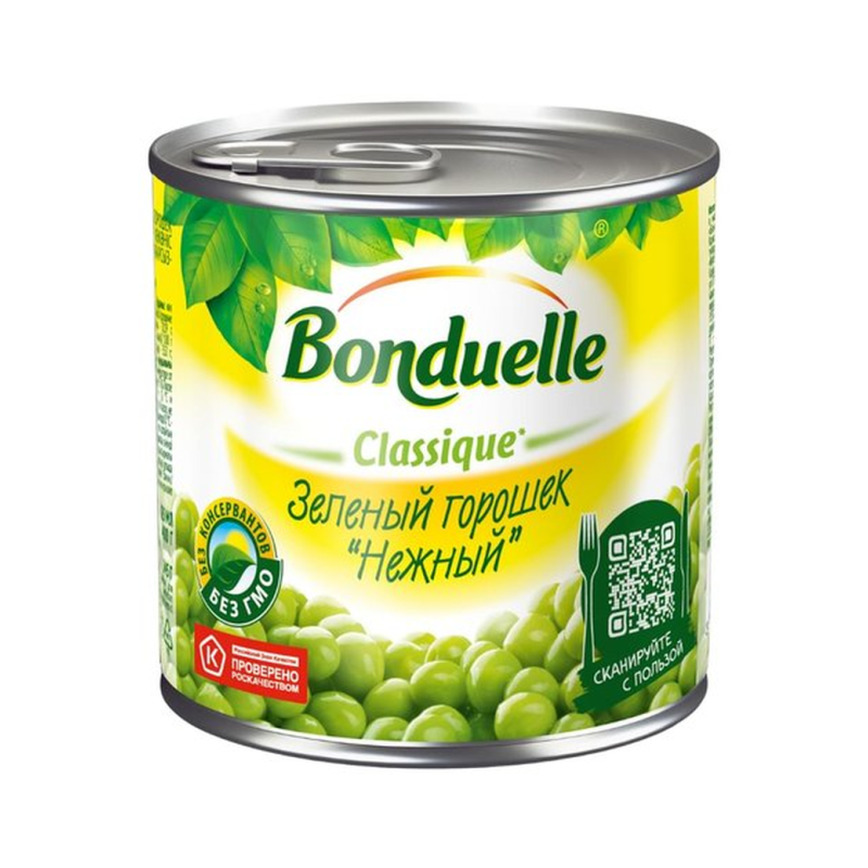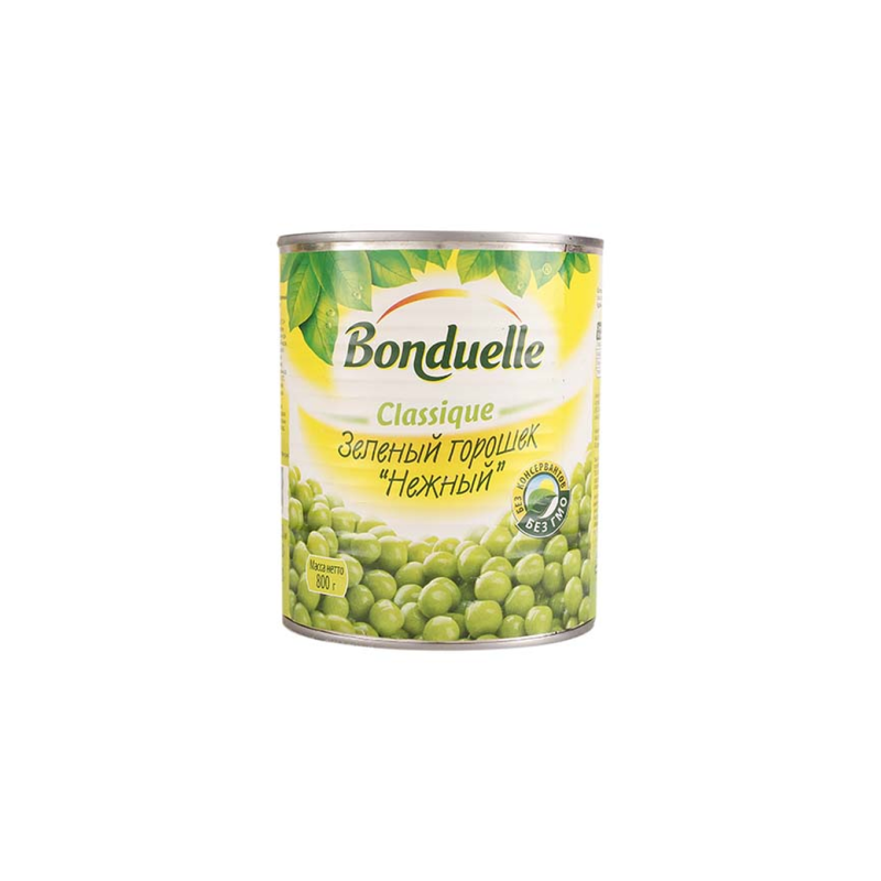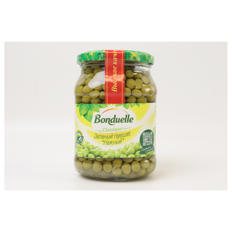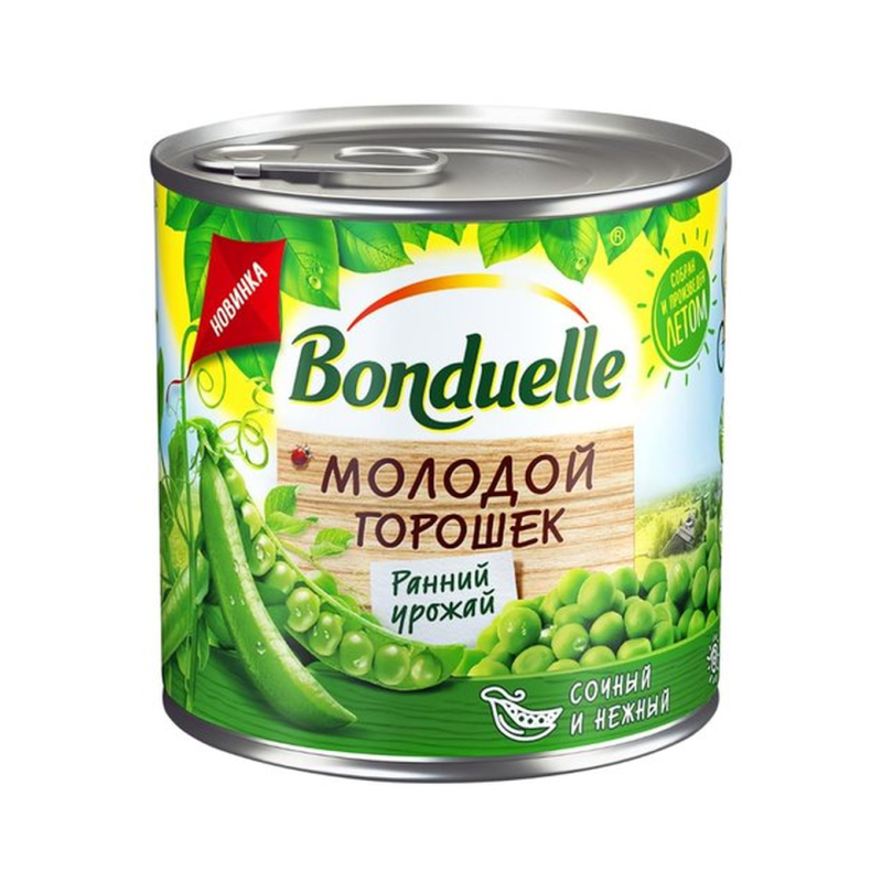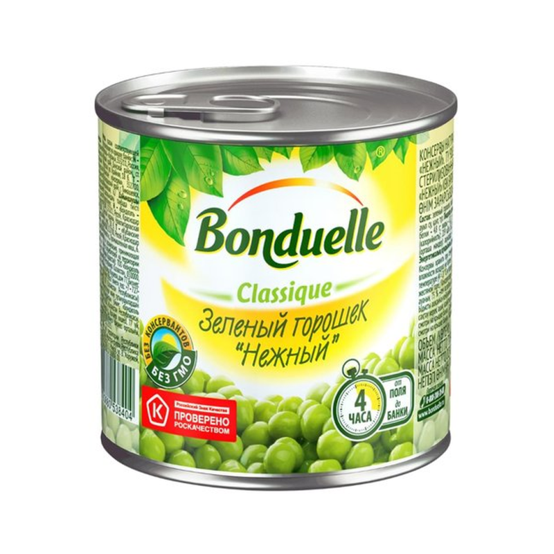 Бондюэль Горошек Молодой - это натуральный продукт из молодого горошка, произведенный по традиционной рецептуре. Он имеет приятный вкус и аромат, а также полезные питательные вещества. Состав продукта: молодой горошек, вода, соль, сахар, лимонная кислота.