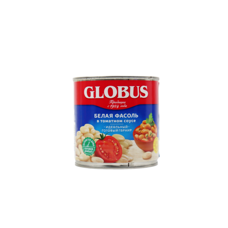 Globus Белая фасоль в томатном соусе - это вкусное блюдо из белой фасоли в томатном соусе. Оно имеет приятный аромат и вкус. Состав блюда: белая фасоль, томатный соус, перец, лук, соль, сахар, приправы. Объем блюда - 425 мл