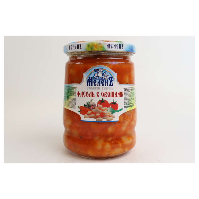 Фасоль с овощами Мелень - это вкусное блюдо из натуральных ингредиентов. Оно состоит из фасоли, моркови, лука, перца и помидоров. Все ингредиенты проходят строгий контроль качества и представлены в упаковке по 580 г