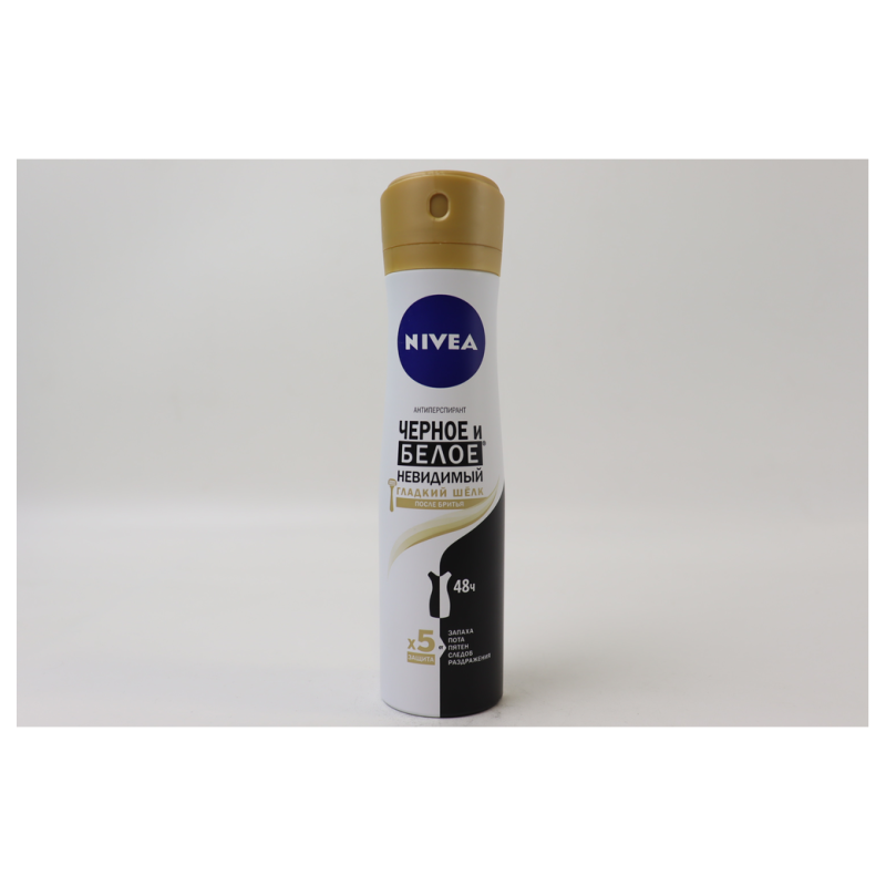 Антиперспирант Nivea Черное/Белое Невидимое Гладкий Шелк в формате 150 мл обеспечивает долговременную защиту от пота и неприятного запаха, при этом не оставляя следов на одежде. Его уникальная формула помогает сохранить чистоту и свежесть, а нежный аромат создает ощущение комфорта на протяжении всего дня.