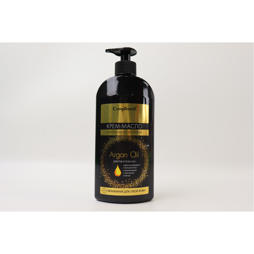 Крем-масло для рук и тела «Compliment Argan Oil 5 в 1» - это универсальное средство для интенсивного увлажнения и питания кожи. Оно содержит масло арганы, которое богато витаминами и жирными кислотами, способствующими улучшению состояния кожи. Крем-масло также может иметь другие полезные свойства, такие как смягчение, защита, восстановление и укрепление кожи. Объем данного продукта составляет 400 мл