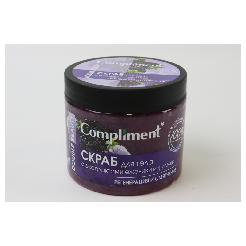 Скраб для тела Compliment Double Beauty с экстрактом ежевики и фиалки объемом 400 мл - это увлажняющее и освежающее средство для ухода за кожей. Его формула, обогащенная натуральными экстрактами ежевики и фиалки, помогает бережно отшелушить и увлажнить кожу, делая её более мягкой и гладкой. После использования этого скраба ваша кожа ощущается освеженной, увлажненной и нежной на ощупь.
