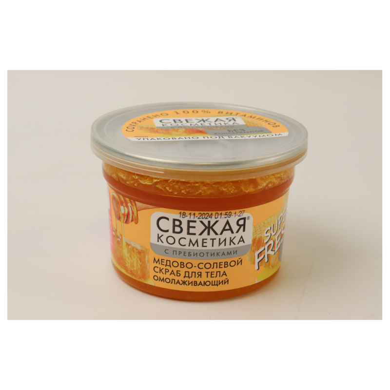 Скраб для тела «Медово-солевой омолаживающий» от Fresh Cosmetics в удобном объеме 180 мл - это богатое ухаживающими компонентами средство, которое помогает эффективно очищать и омолаживать кожу. Его формула, насыщенная медом и морской солью, помогает удалить ороговевшие клетки, стимулирует циркуляцию крови и способствует обновлению кожи, придавая ей мягкость и упругость. Регулярное использование этого скраба оставляет кожу гладкой, освеженной и сияющей, обеспечивая приятное ощущение омоложения и ухода.