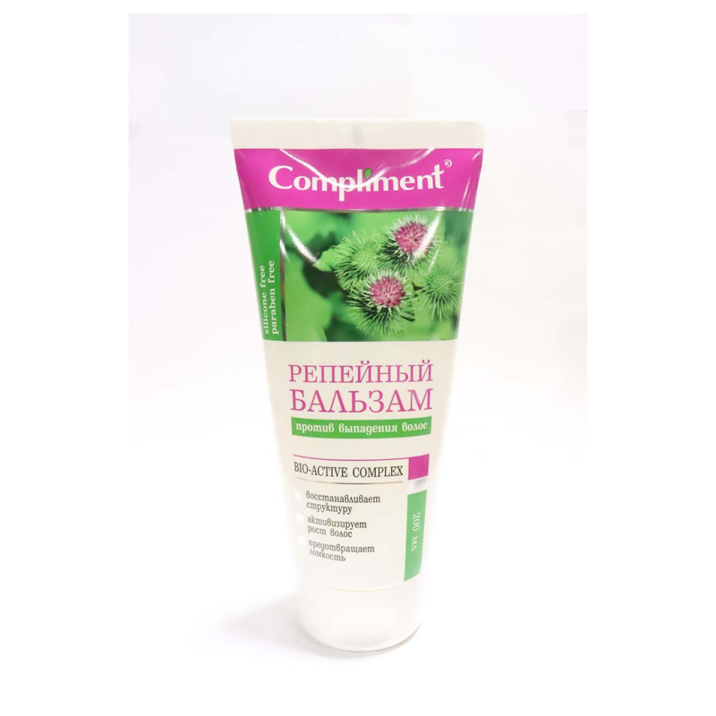 Бальзам репейный Compliment - это натуральное средство против выпадения волос, которое поможет укрепить и питать ваши волосы. Специально разработанная формула бальзама содержит экстракт репейника, который способствует укреплению корней волос и стимулирует их рост. Бальзам также обладает увлажняющими свойствами, делая волосы мягкими и шелковистыми. Используйте бальзам репейный Compliment после каждого мытья волос для лучших результатов. Нанесите небольшое количество продукта на влажные волосы, распределите равномерно по всей длине и оставьте на несколько минут, затем тщательно смойте. Для дополнительного увлажнения и питания волос, попробуйте использовать бальзам в качестве маски - нанесите на влажные волосы, укутайте голову полотенцем и оставьте на 15-20 минут, затем смойте. Попробуйте бальзам репейный Compliment уже сегодня и наслаждайтесь здоровыми и красивыми волосами!