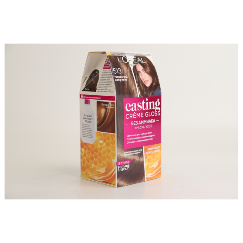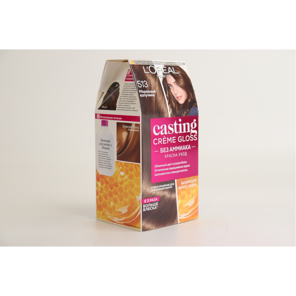 Оттенок 513 «Морозный капучино» (Frosted Cappuccino) в краске для волос Casting Creme Gloss придает волосам приглушенный, мягкий и теплый оттенок капучино с легкими холодными нотками. Этот оттенок создает нежный и естественный образ, подчеркивая красоту вашего внешнего вида. Формула краски без аммиака помогает сохранить здоровье волос, делая их мягкими, блестящими и ухоженными.