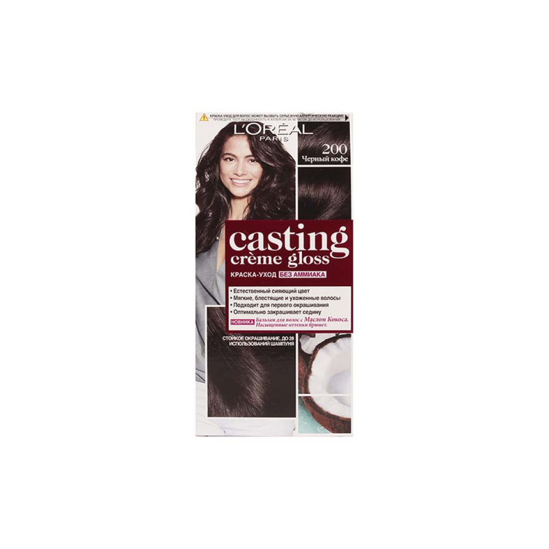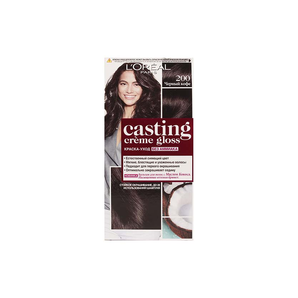 Краска для волос Casting Creme Gloss в оттенке 200 Черный Кофе (Black Coffee) предоставляет насыщенный черный цвет с оттенком кофе. Этот оттенок обычно придает волосам теплоту и глубину, создавая естественный и элегантный вид. Кроме того, благодаря формуле без аммиака, она помогает сохранить здоровье и блеск волос.