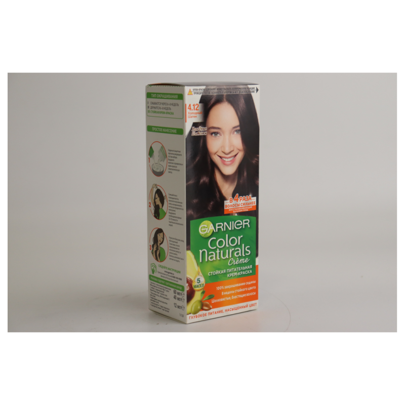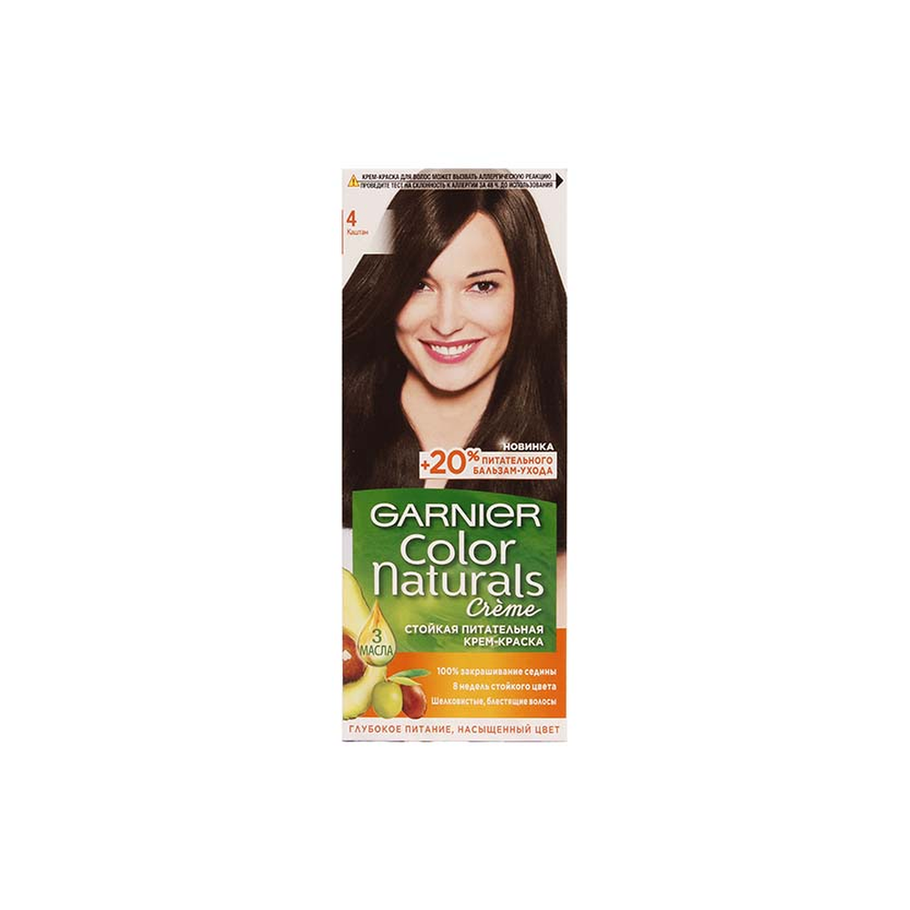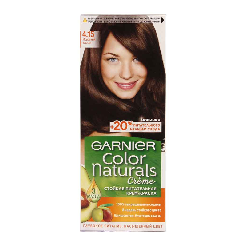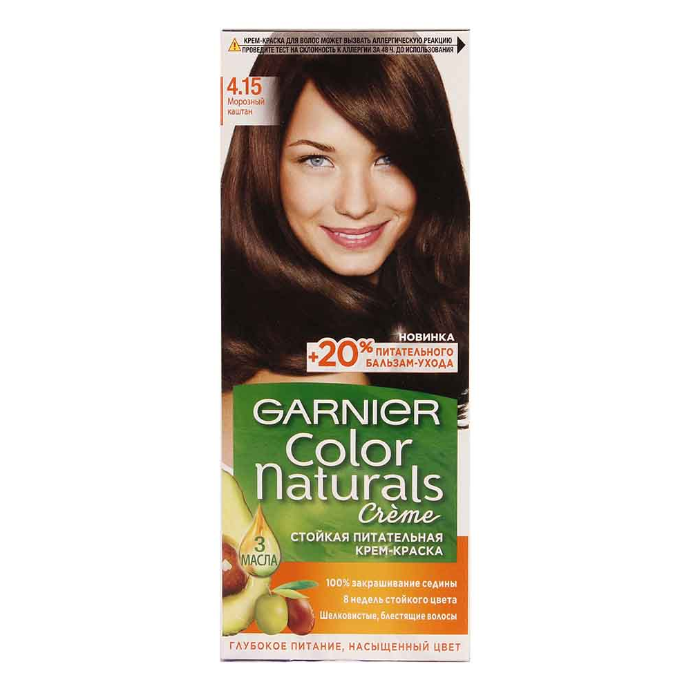 Краска для волос Garnier Color Naturals 4 15 «Морозный каштан» создает насыщенный темно-коричневый оттенок с нотами каштана, придавая волосам естественный и благородный вид.
