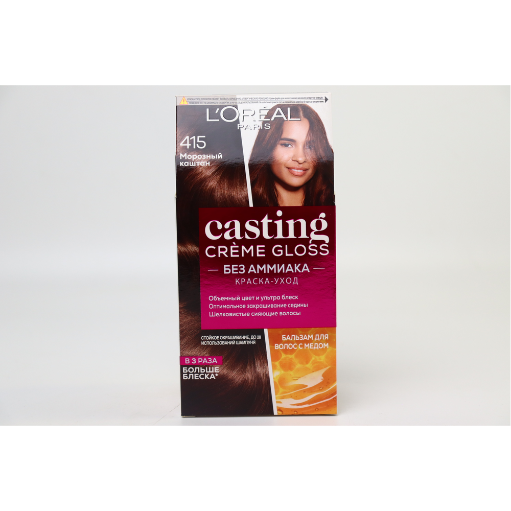 Оттенок 415 «Морозный каштан» (Frosted Chestnut) в краске для волос Casting Creme Gloss предлагает элегантный и приглушенный оттенок каштана с прохладными, морозными нюансами. Этот оттенок создает естественный и насыщенный вид волос, придавая им особый блеск и мягкость. Формула краски без аммиака позволяет окрашивать волосы, не повреждая их структуру, и делает их более здоровыми и ухоженными.