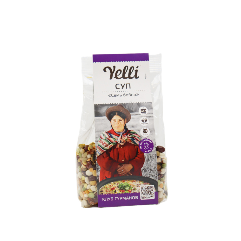 Суп Yelli семь бобов в упаковке весом 250 г амм, вероятно, представляет собой готовый суп, в котором используется смесь из семи различных видов бобов. Этот продукт, вероятно, богат питательными веществами и может включать в себя разнообразные ингредиенты для обогащения вкуса и текстуры.