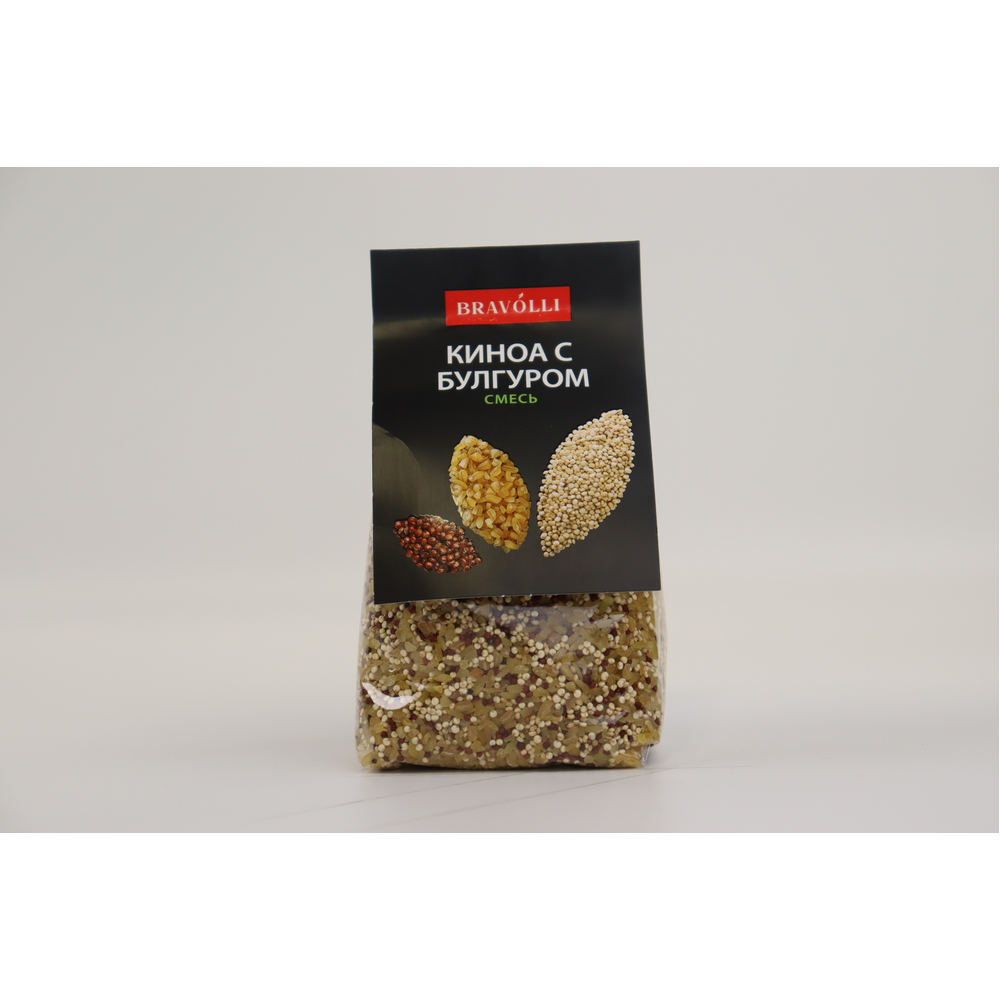 Смесь киноа с булгуром Bravolli в упаковке весом 350 г амм представляет собой продукт, содержащий комбинацию киноа и булгура. Киноа и булгур являются зерновыми культурами, богатыми питательными веществами, и их смесь может использоваться для приготовления разнообразных блюд.