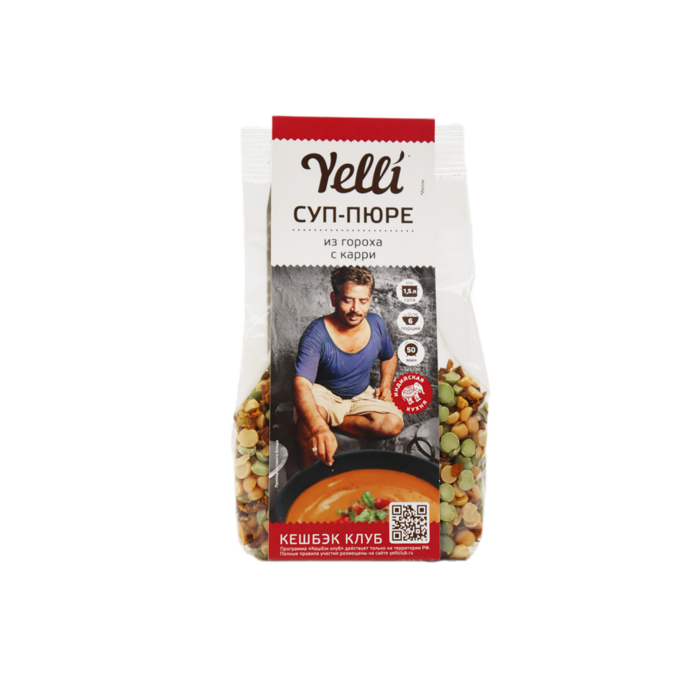 Суп-пюре Yelli из гороха с карри в упаковке весом 250 г амм, вероятно, представляет собой готовый суп-пюре, в котором основным ингредиентом является горох, а также добавлены приправы, в том числе карри, для придания особого вкуса.