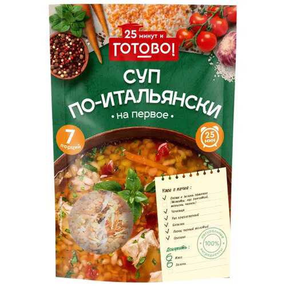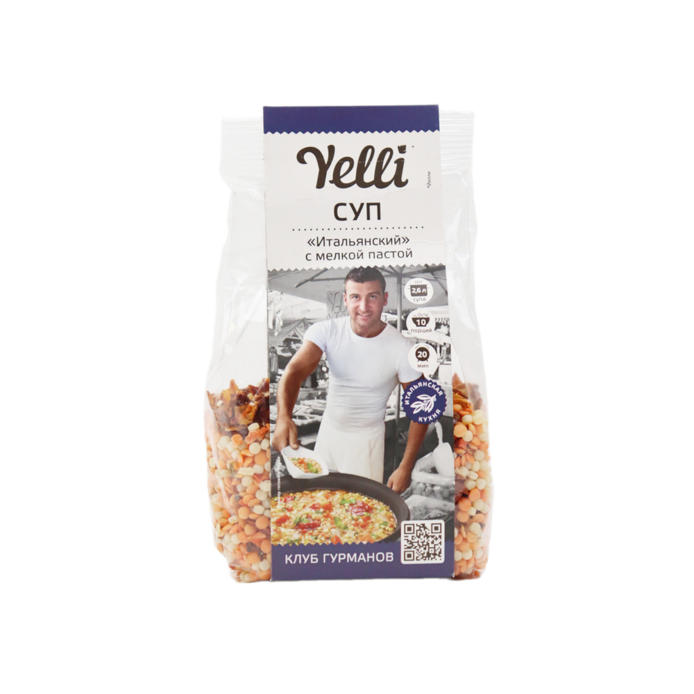 Суп Yelli итальянский с мелкой пастой в упаковке весом 250 г амм вероятно представляет собой готовый суп с итальянским влиянием, содержащий мелкую пасту и, возможно, другие ингредиенты, характерные для итальянской кухни.