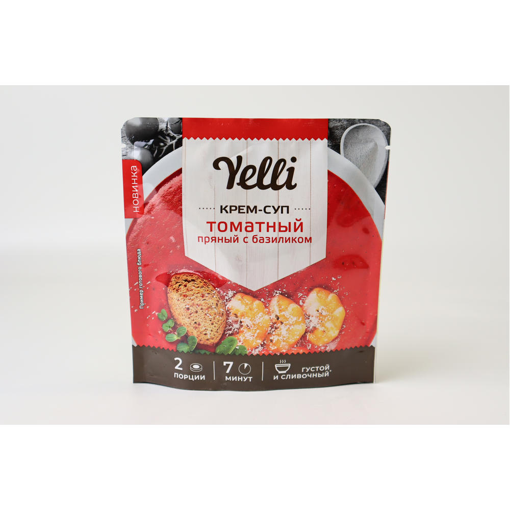 Крем-суп томатный пряный с базиликом от Yelli весом 70 г амм - это удобный и вкусный продукт для быстрого приготовления с насыщенным томатным вкусом и ароматом базилика.