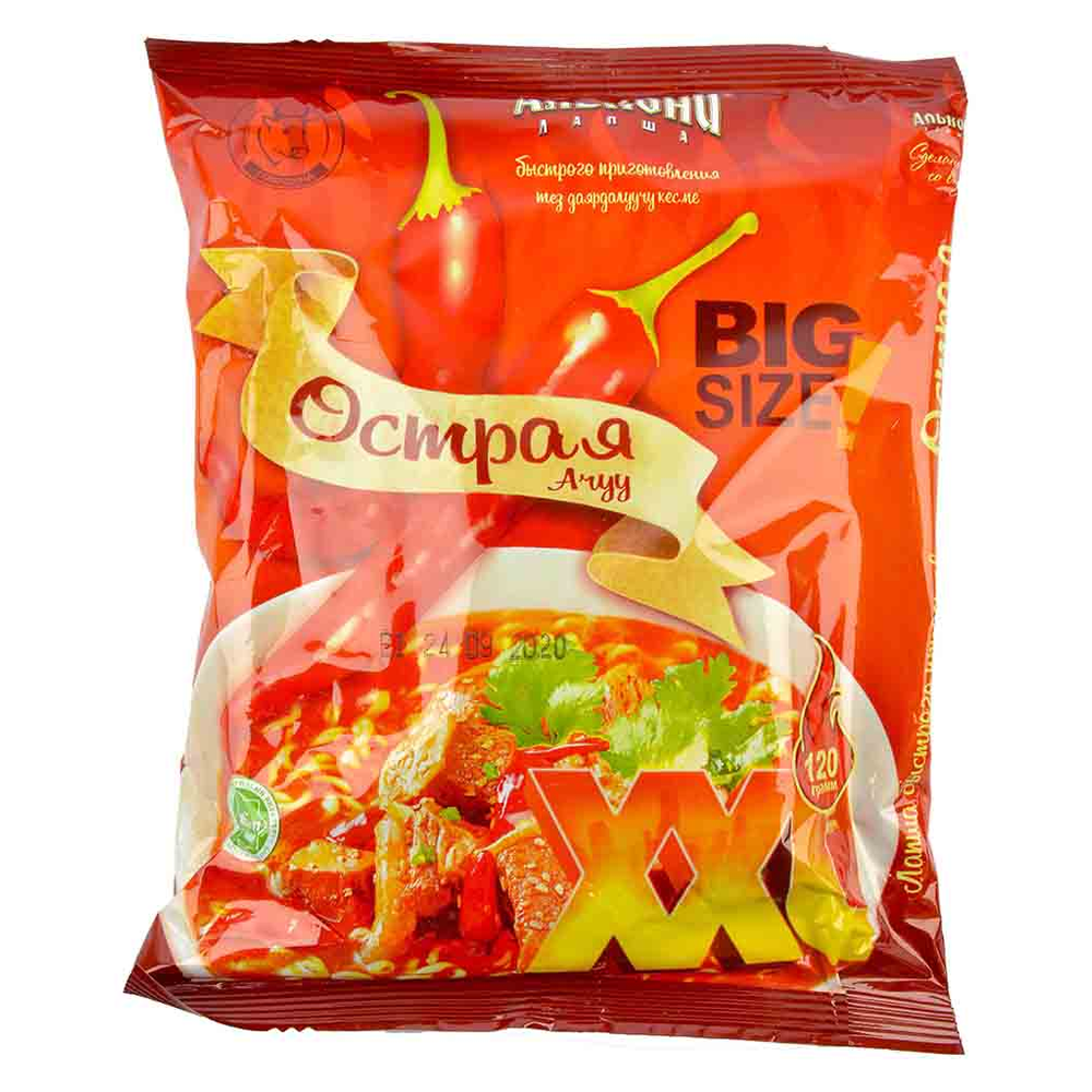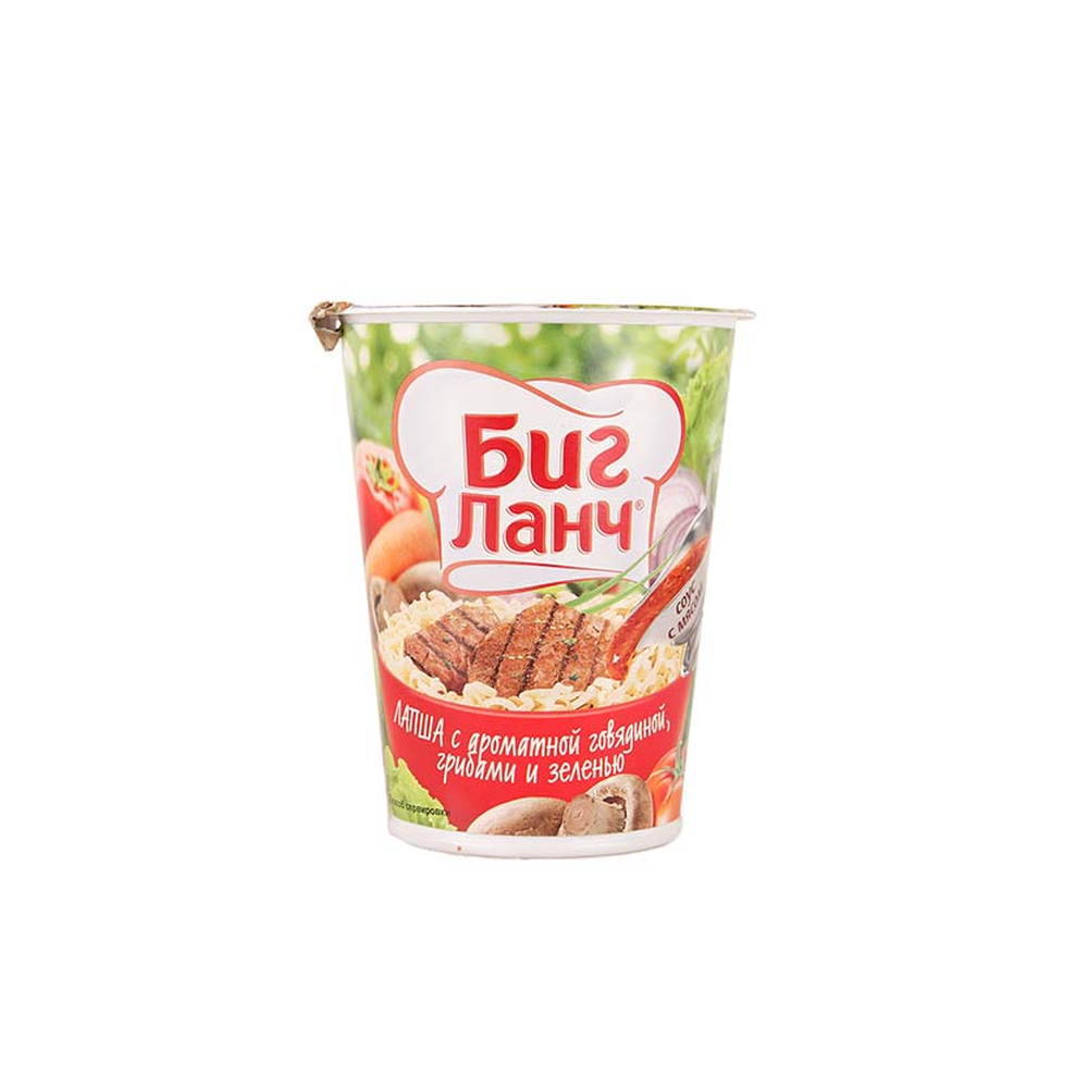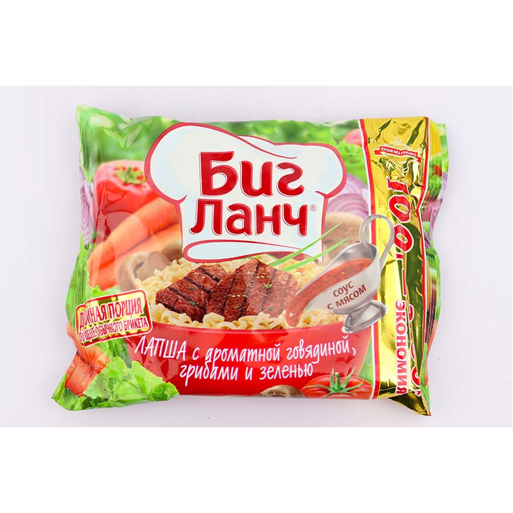 Лапша биг ланч с добавлением кусочков говядины, грибов и зелени, а также смеси пряностей и суповой основы. Лапша приготовлена из муки из твердых сортов пшеницы. Суповая основа содержит густой мясной бульон с добавлением кусочков овощей и грибов.