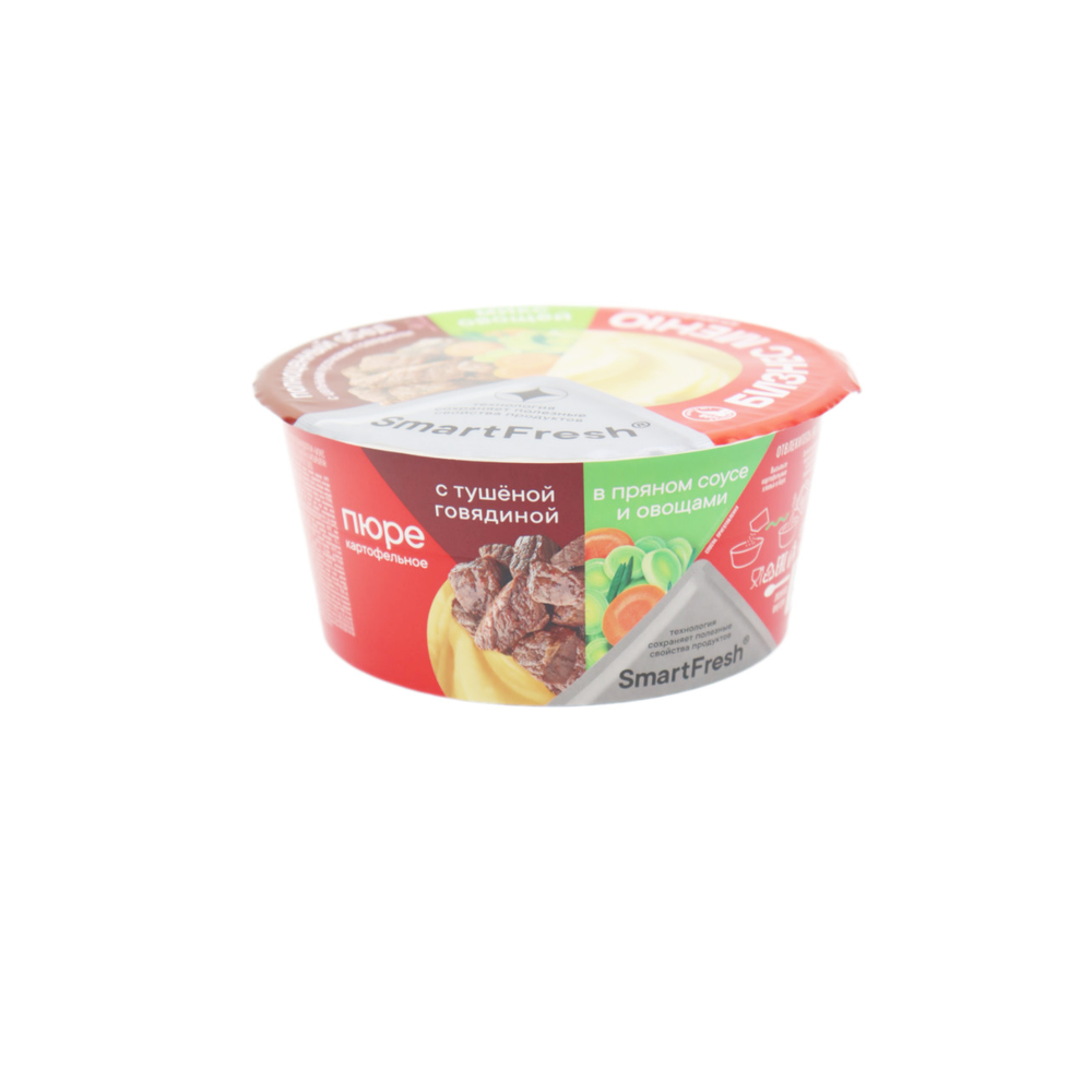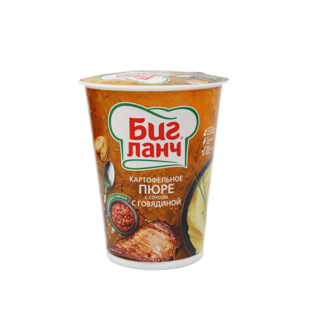 Пюре картоф биг/ланч соус с говядиной 50 г – это блюдо, представляющее собой пюре из картофеля и говядины, приготовленное в ланч-соусе. Состав блюда: картофель, говядина, ланч-соус, соль, перец.