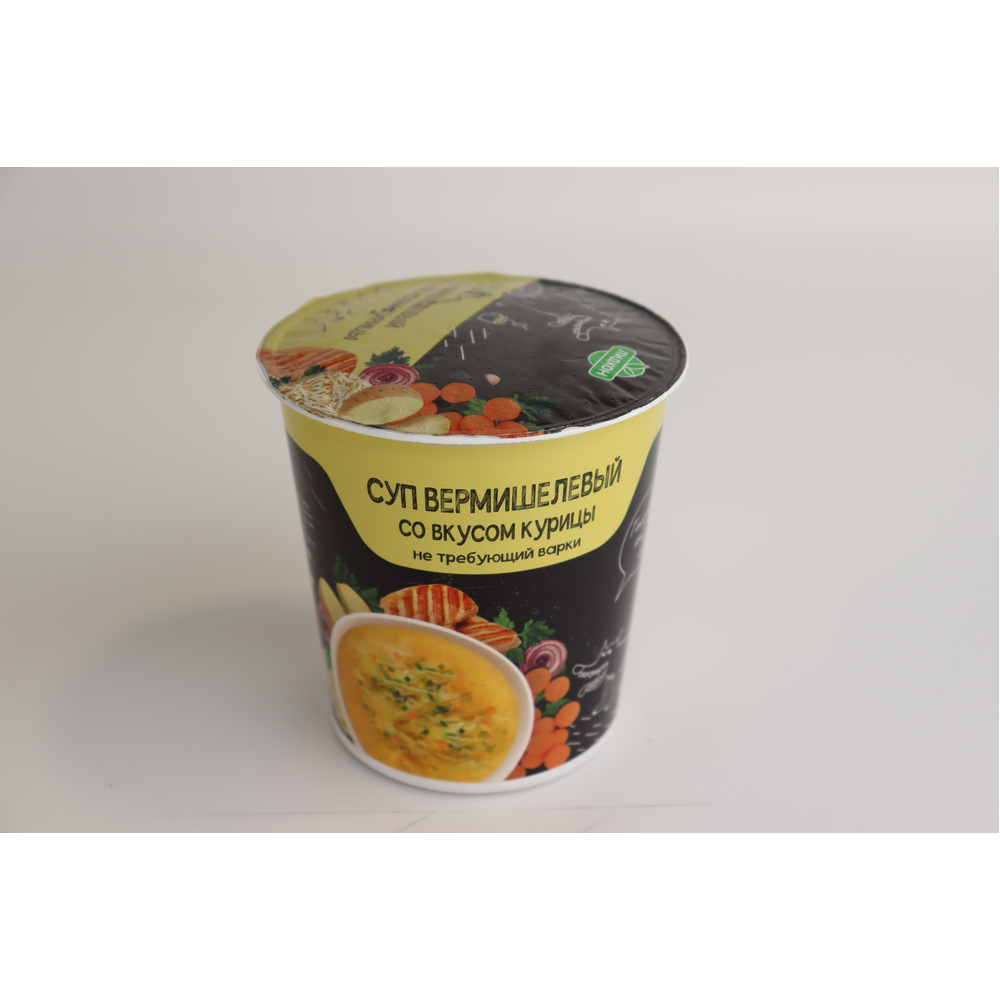 Суп вермишелевый с вкусом курицы, не требующий варки и упакованный в стаканчике весом 25 г амм, представляет собой удобный и быстрый в приготовлении продукт, который обычно можно приготовить простым добавлением горячей воды.
