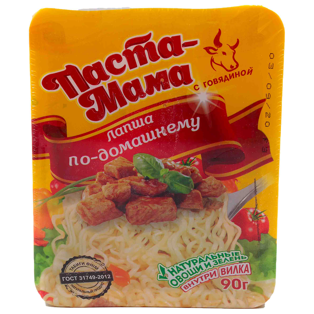 Лапша паста Мама Говядина По Дом/Конт 90 г - это продукт из мяса говядины, приготовленный по специальному рецепту. Состав продукта: говядина, лапша, перец, лук, соль, приправы.