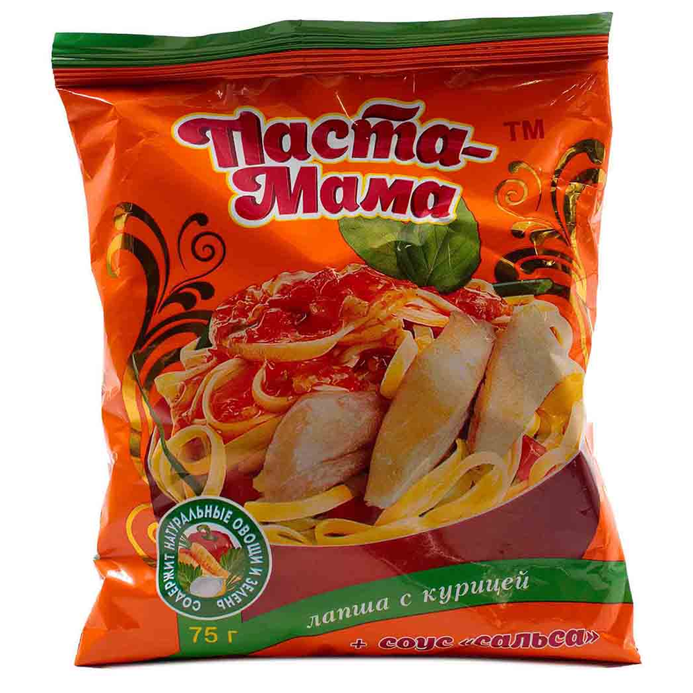 Лапша Паста Мама Курица/Соус Сальса 75 г - это продукт из муки пшеницы и воды с добавлением куриного бульона и соуса Сальса. Состав: мука пшеницы, вода, куриный бульон, соус Сальса, соль, пищевые добавки.