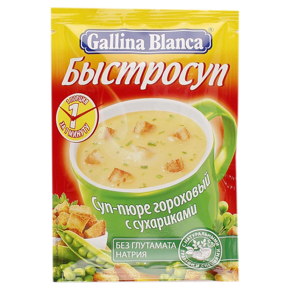 Быстросуп Gallina Blanca Пюре Горохов с Сухарами – это быстрое приготовление пюре из гороха и сухарей, которое можно приготовить за несколько минут. Продукт содержит горох, сухари, масло растительное, соль, перец и другие ингредиенты. Это простое и вкусное блюдо, которое можно приготовить быстро и легко.