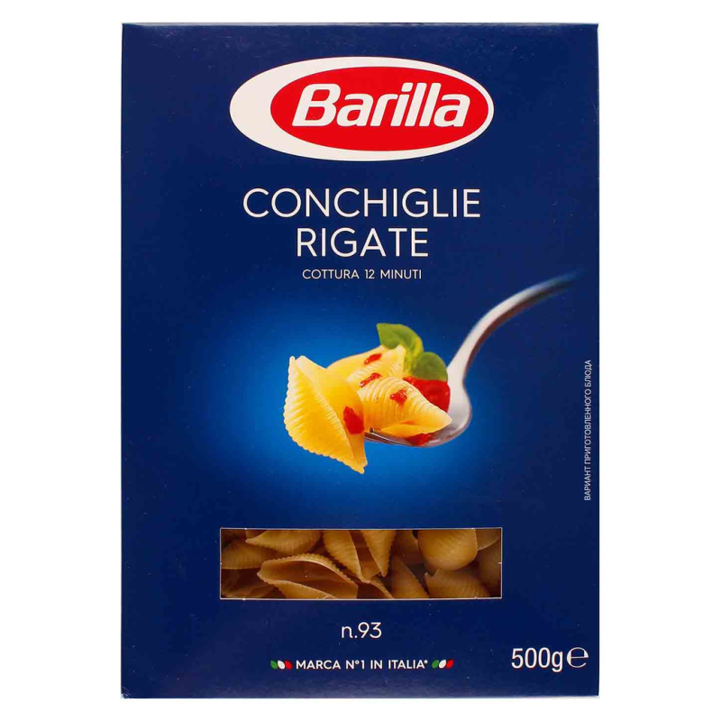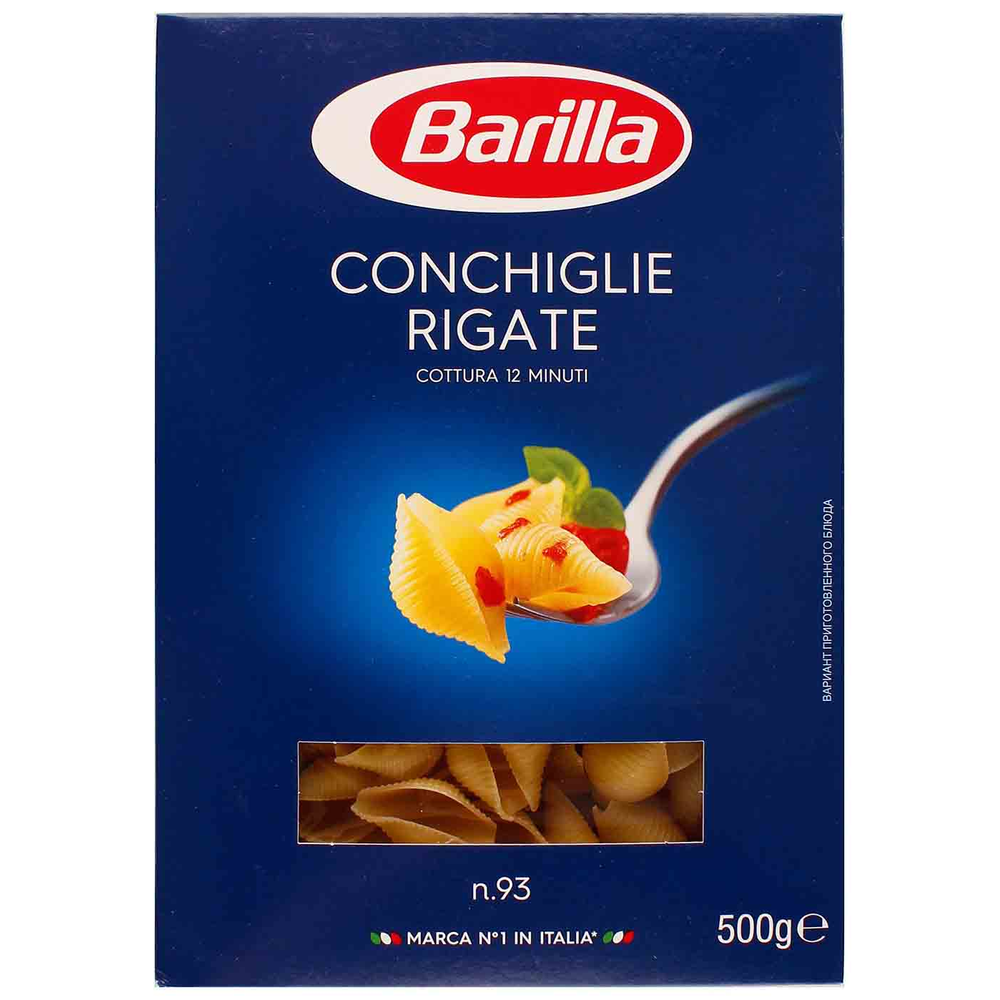 Макароны Barilla конкилье ригате 500 г Для пасты такой величественной формы идеально подходят соусы, способные оценить её по достоинству: широкая внутренняя полость конкилье ригате хранит в себе аромат соуса, раскрывая его для вас с неожиданной стороны. Мы рекомендуем вам приготовить конкилье ригате в соответствии с традиционными рецептами различных регионов Италии – и, в особенности, кухни региона Апулия, в которой дары моря на особом счету: попробуйте соус с мидиями, брокколи и томатами черри
