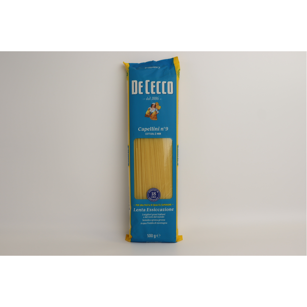 Макаронные изделия De Cecco Capellini 9 - это итальянские макароны из пшеничной муки первого качества. Они имеют тонкую форму и идеально подходят для приготовления любых блюд. Состав макаронных изделий De Cecco Capellini 9 включает в себя только пшеничную муку и воду.