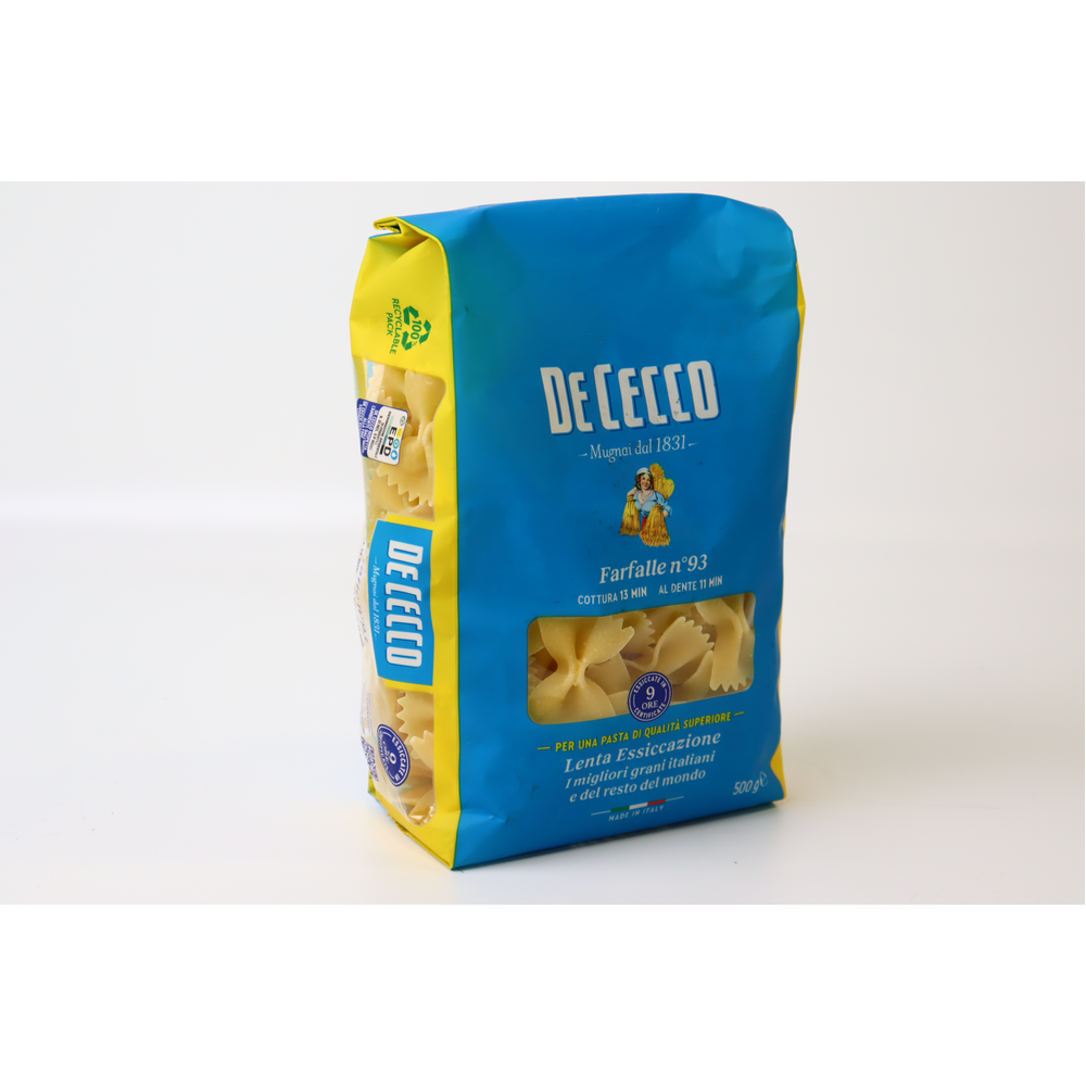 Макаронные изделия De Cecco Farfalle 93 500 г - это итальянские макароны в виде бабочек, изготовленные из высококачественной пшеницы и воды. Они имеют приятную текстуру и вкус, а также прекрасно подходят для приготовления различных блюд. Состав макаронных изделий De Cecco Farfalle 93 500 г : пшеница, вода.